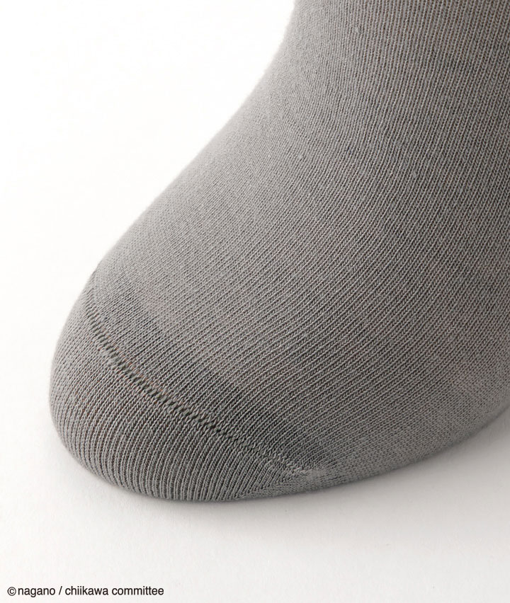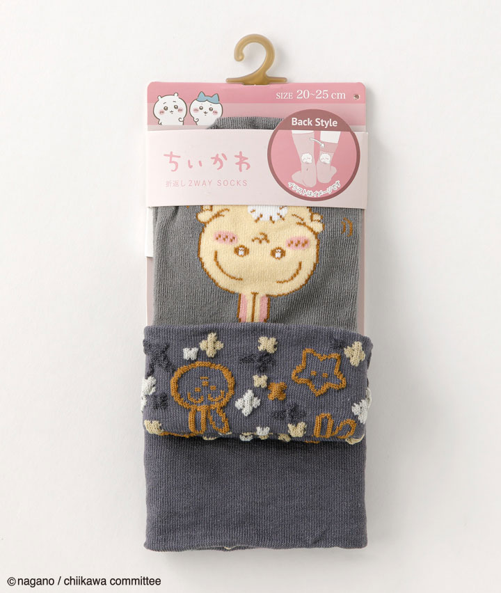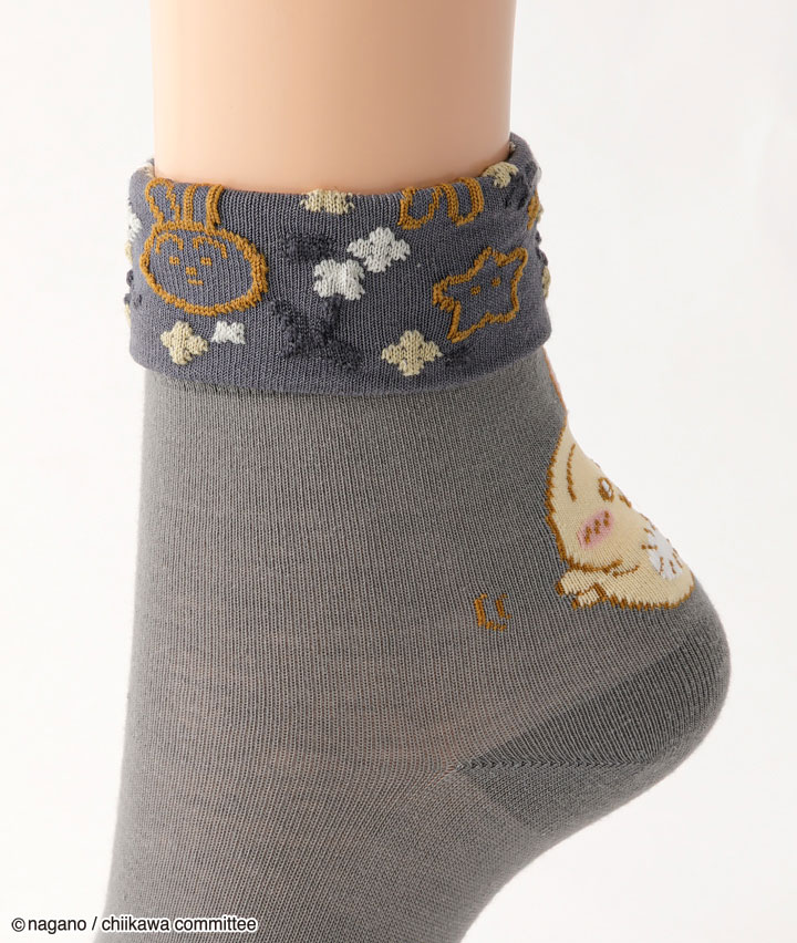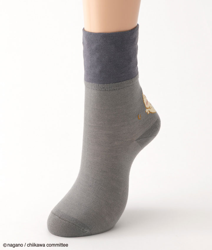 ・イラストレーター・ナガノ氏が描く X( 旧 Twitter) 発の漫画「ちいかわ」の婦人ソックスです。伸ばすと無地、折り返すと柄入りデザインの2wayクルーソックス。バックスタイルがかわいい!