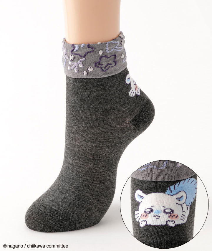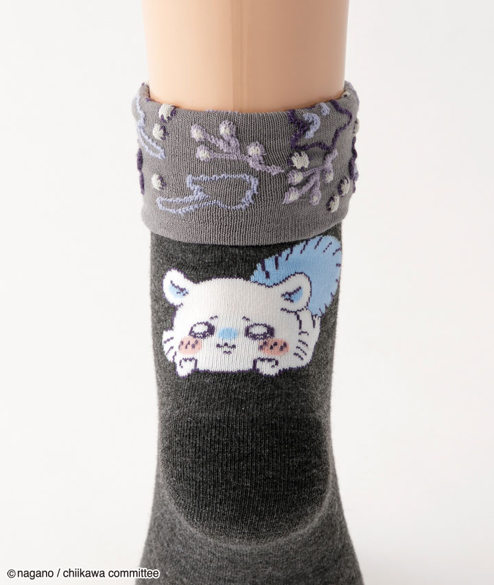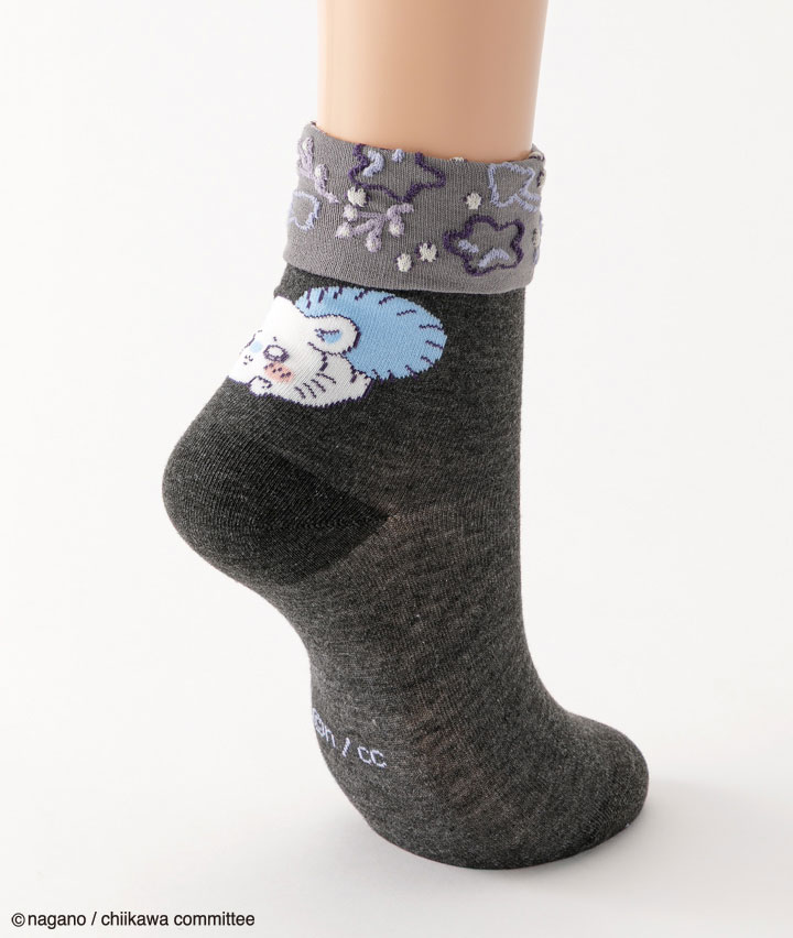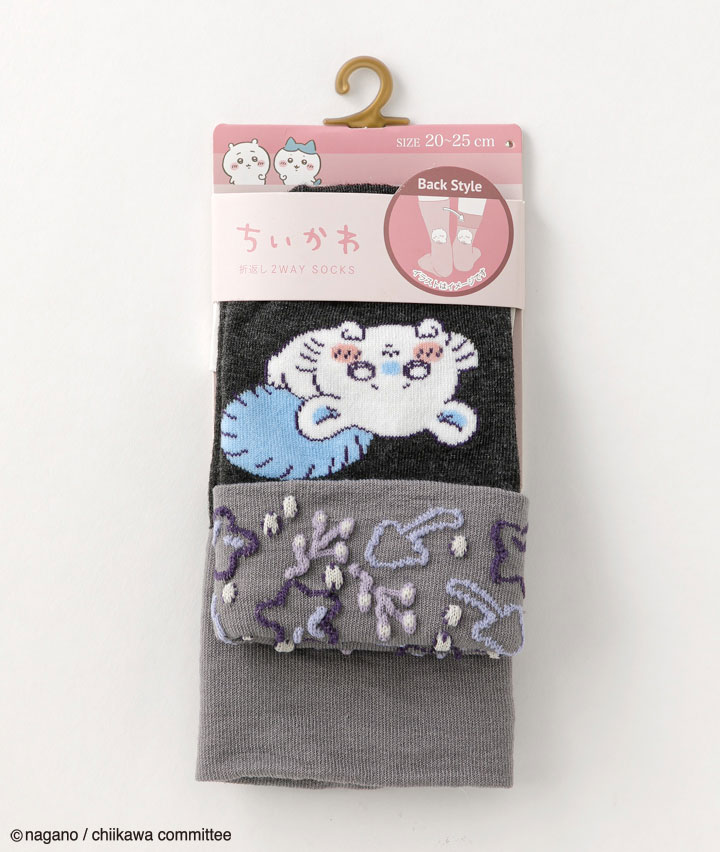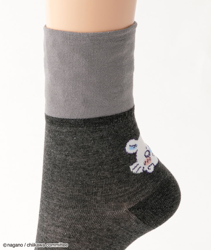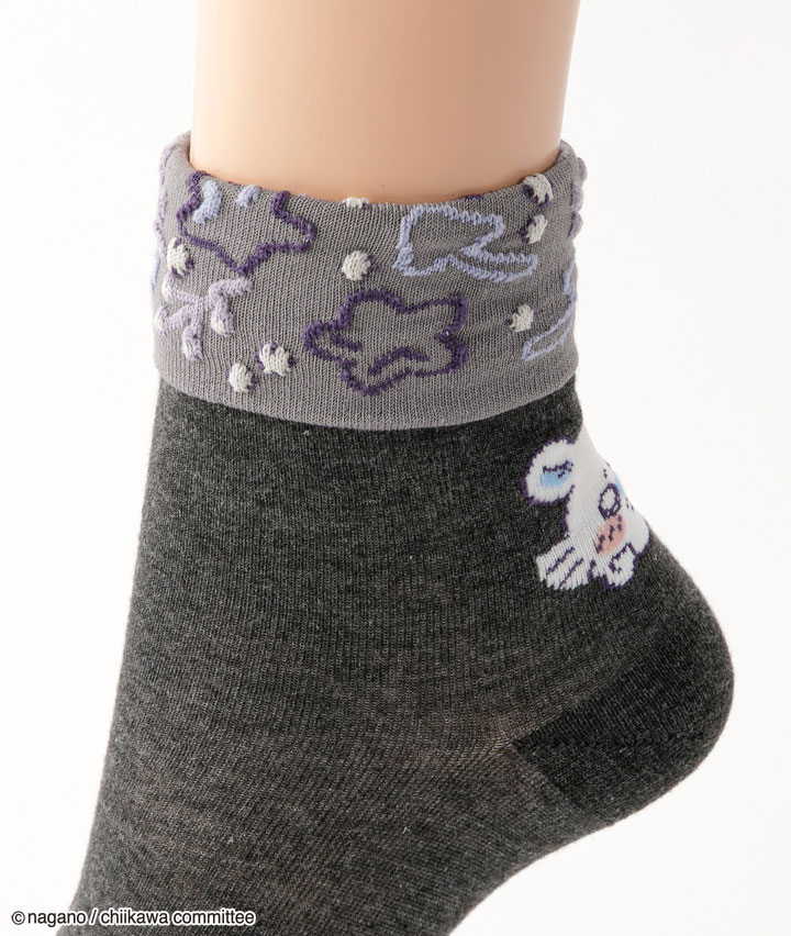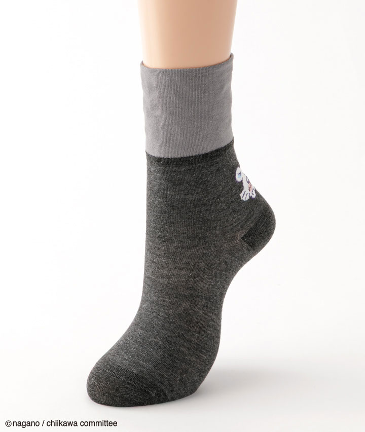 ・イラストレーター・ナガノ氏が描く X( 旧 Twitter) 発の漫画「ちいかわ」の婦人ソックスです。伸ばすと無地、折り返すと柄入りデザインの2wayクルーソックス。バックスタイルがかわいい!