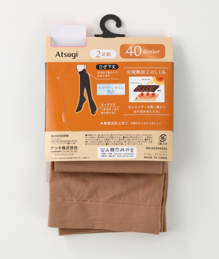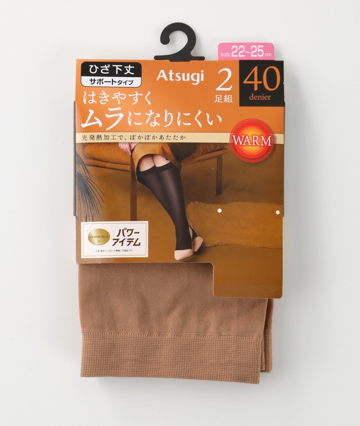 ・2足組40デニールひざ下丈。はきやすくムラになりにくい。光発熱加工でぽかぽかあたたか。つま先ヌードトウ。静電気防止加工。