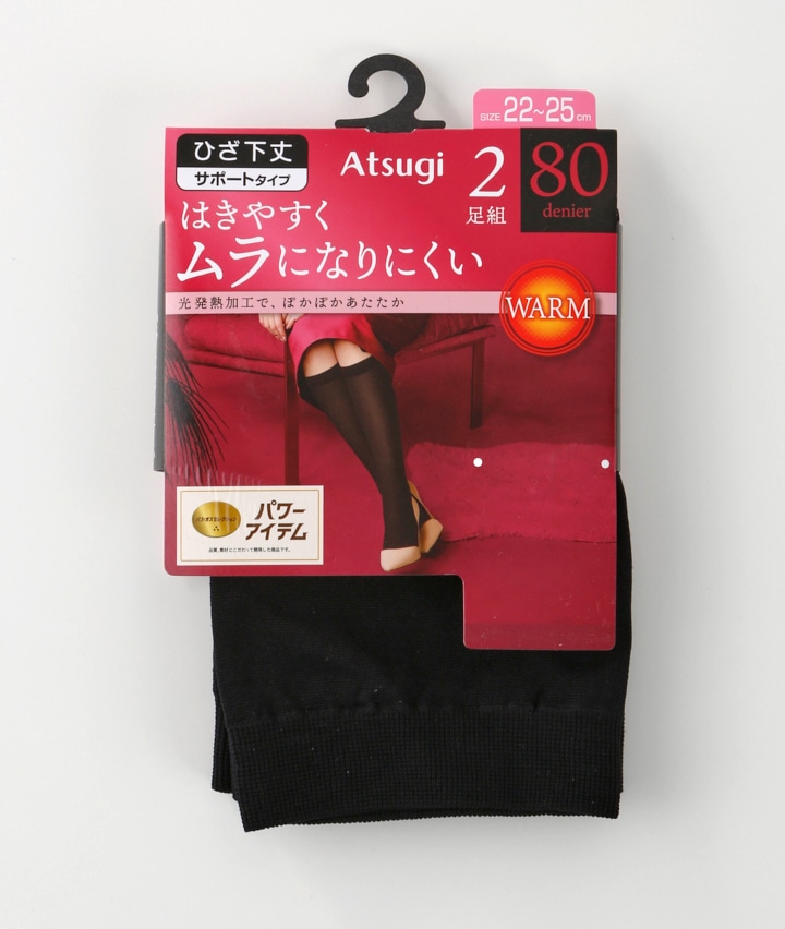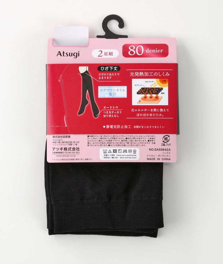 ・2足組80デニールひざ下丈。はきやすくムラになりにくい。光発熱加工でぽかぽかあたたか。つま先ヌードトウ。静電気防止加工。