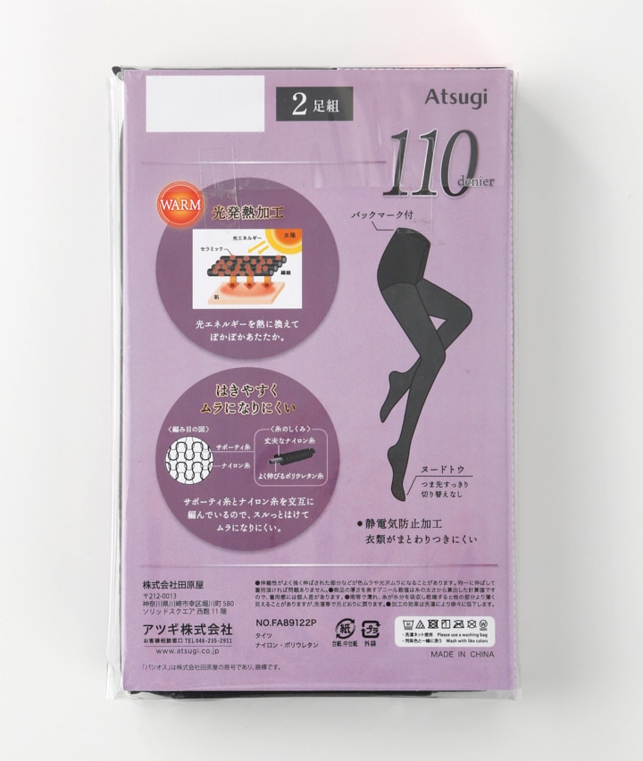 ・2足組110デニールタイツ。はきやすくムラになりにくい。光発熱加工で、ぽかぽかあたたか。静電気防止加工。つま先ヌードトウ。