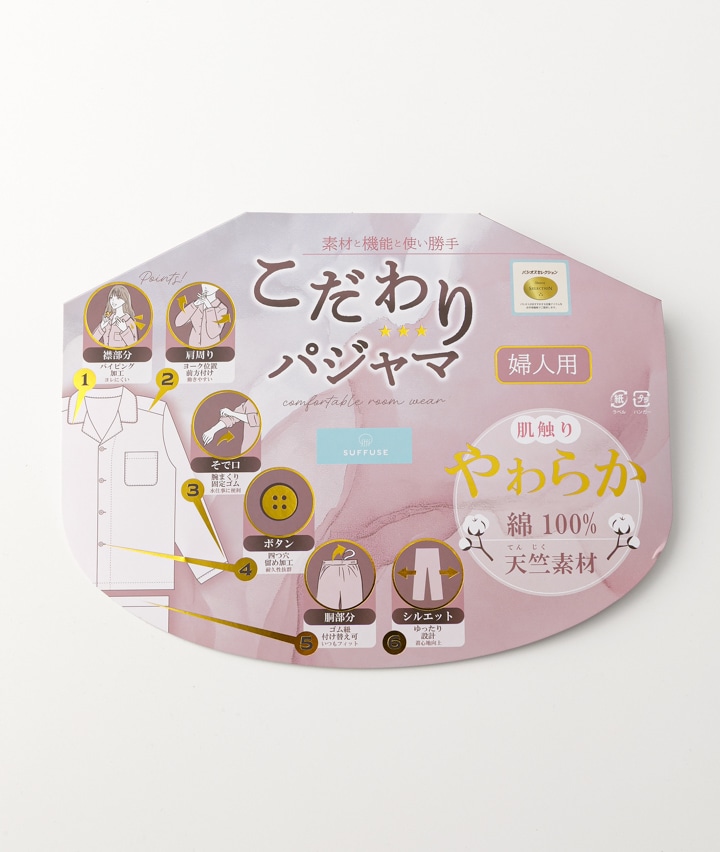 ・素材と仕様にこだわったパシオスおすすめパジャマ。吸水性の高い綿素材を使用。動きやすい肩回り設計。