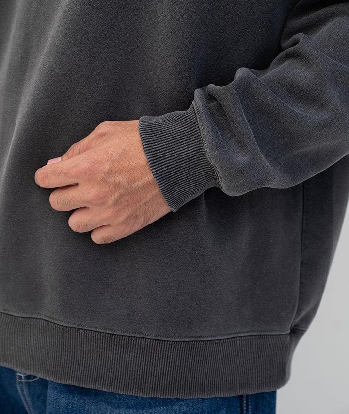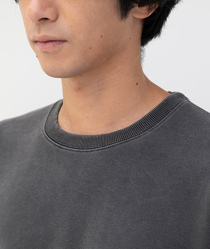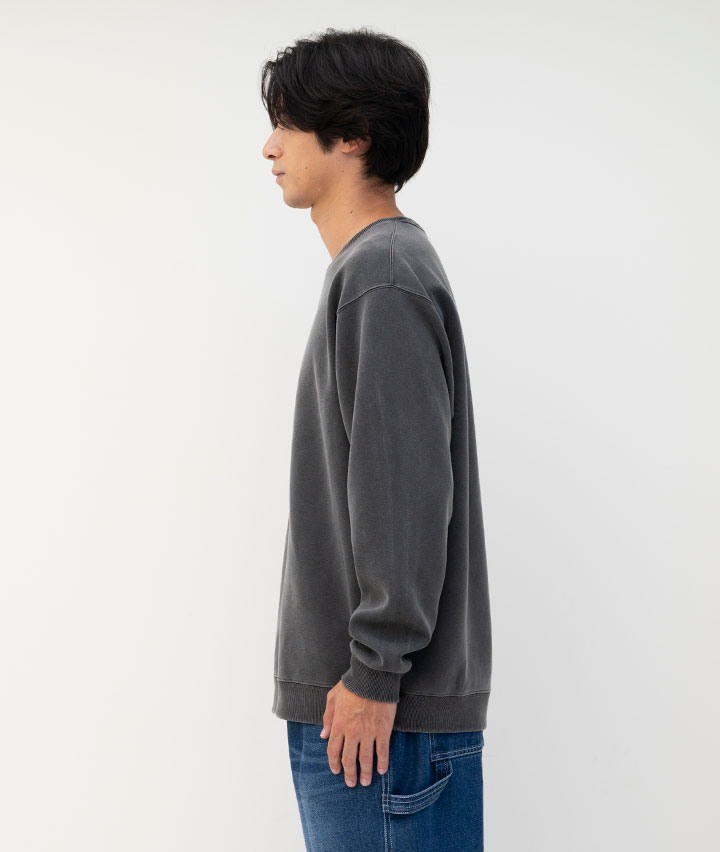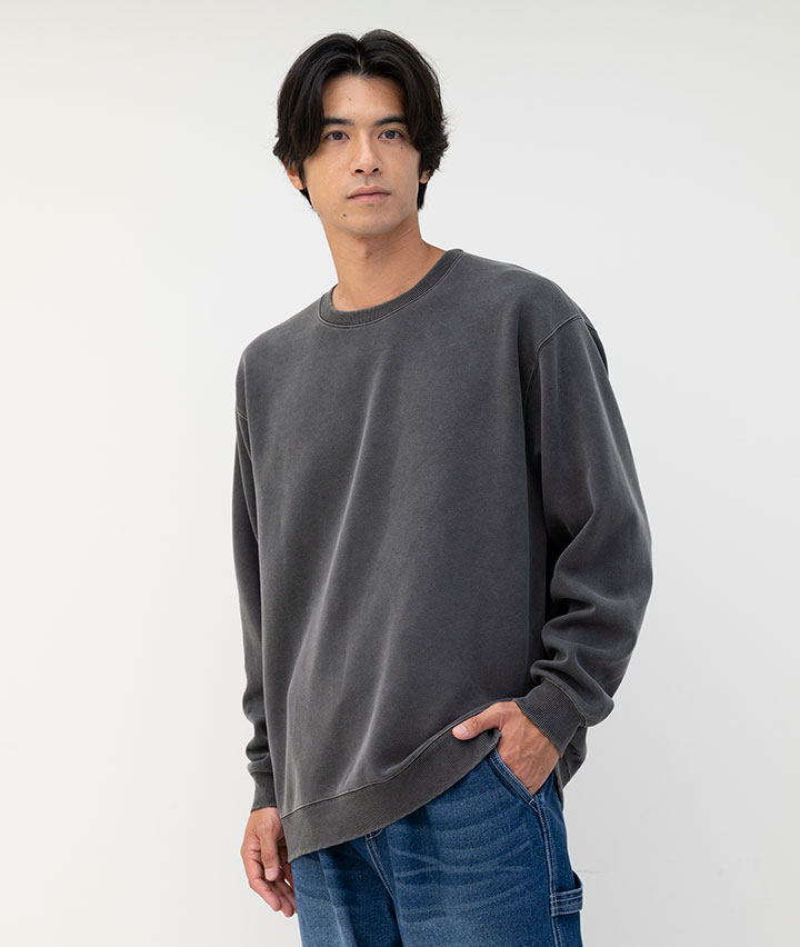・ピグメント加工をしたダンボールニットトレーナーです。古着っぽい雰囲気とダンボールニットの着心地の良さを併せ持っています。ゆとりのあるワイドシルエットで旬なコーディネートを作り出します。