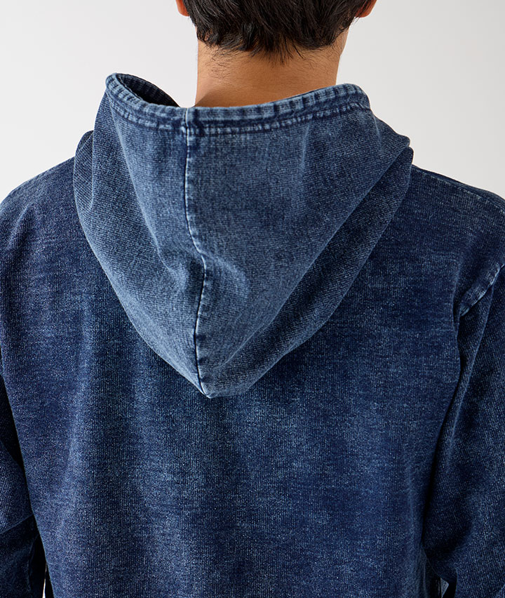 ・カットデニムの素材にケミカル加工を加えたジップパーカータイプ。