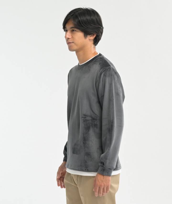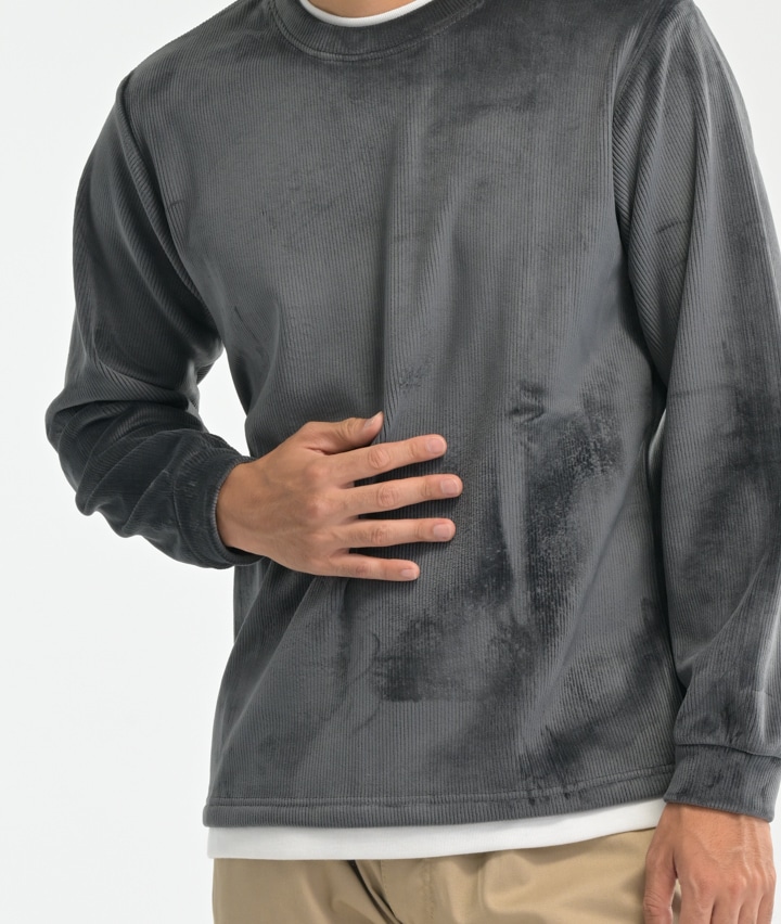 ・カットコーデュロイ素材を使用したカットソー。裏ベロア素材で暖か。
