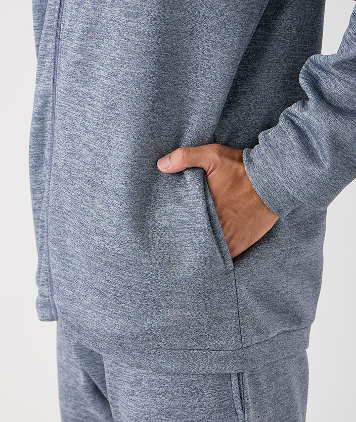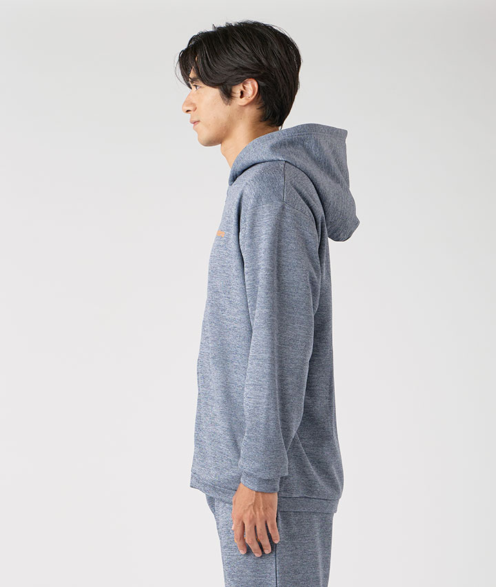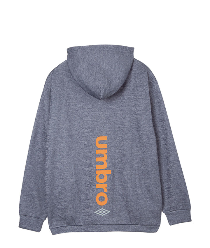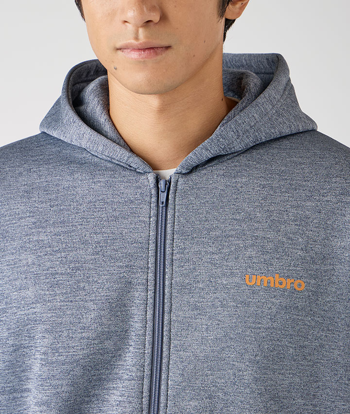 ・UMBROのフルジップパーカーです。カチオン杢の生地にバックプリントのロゴがポイントです。裏地は裏起毛であたたかい機能があります。