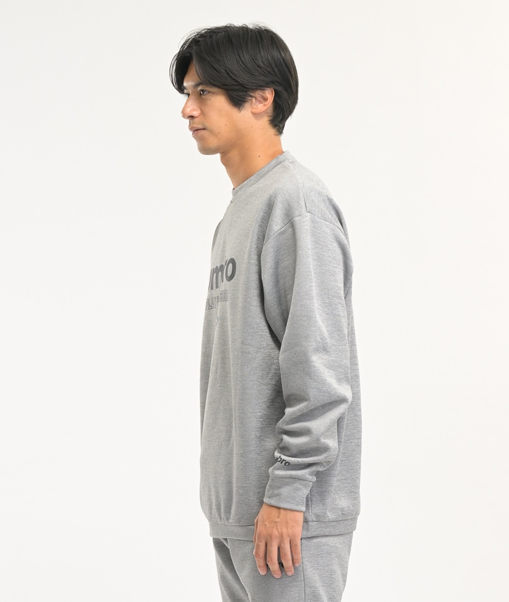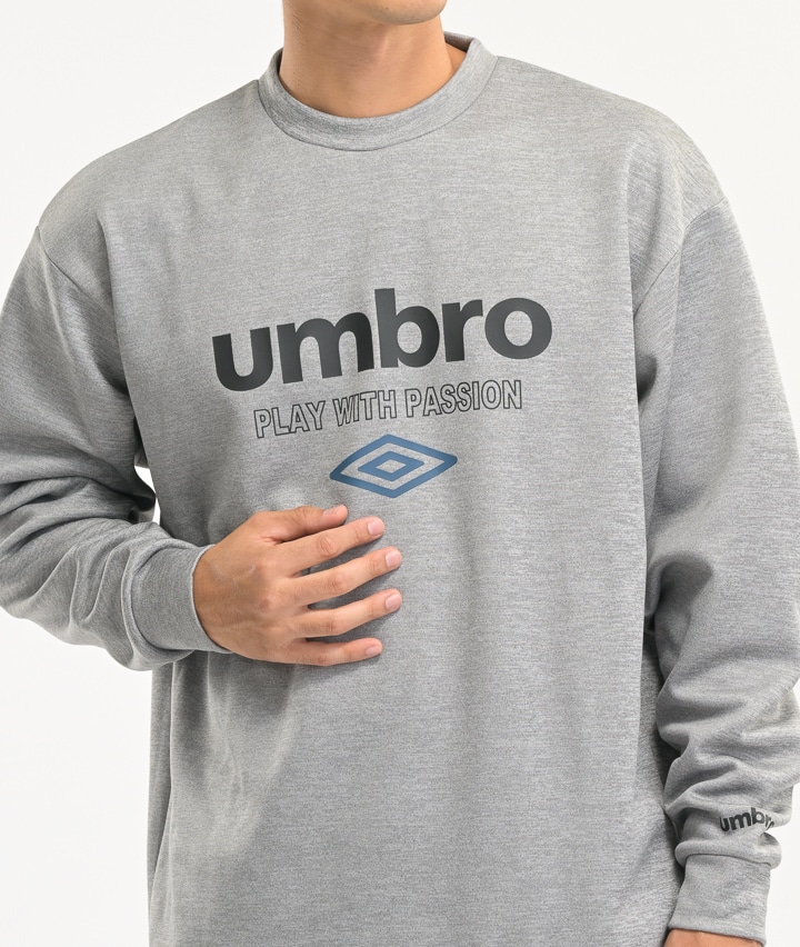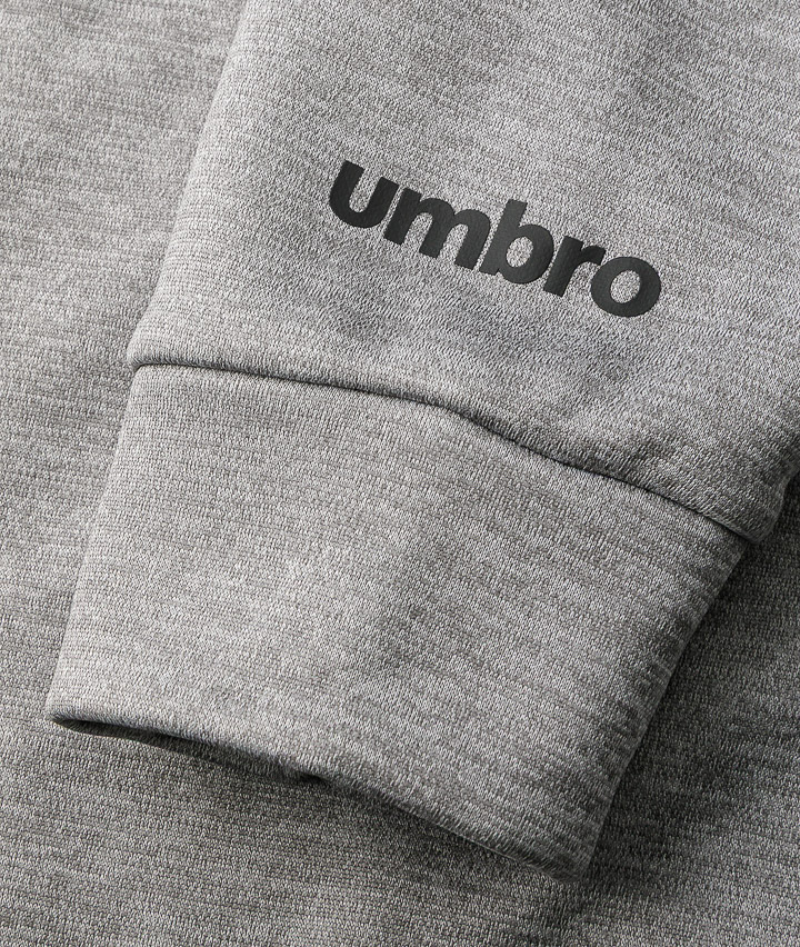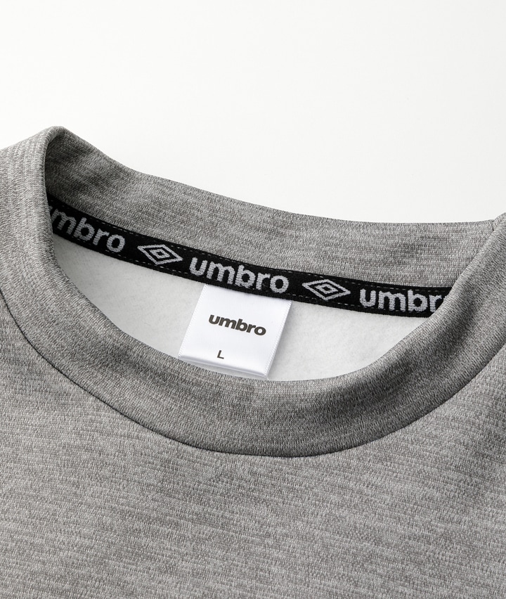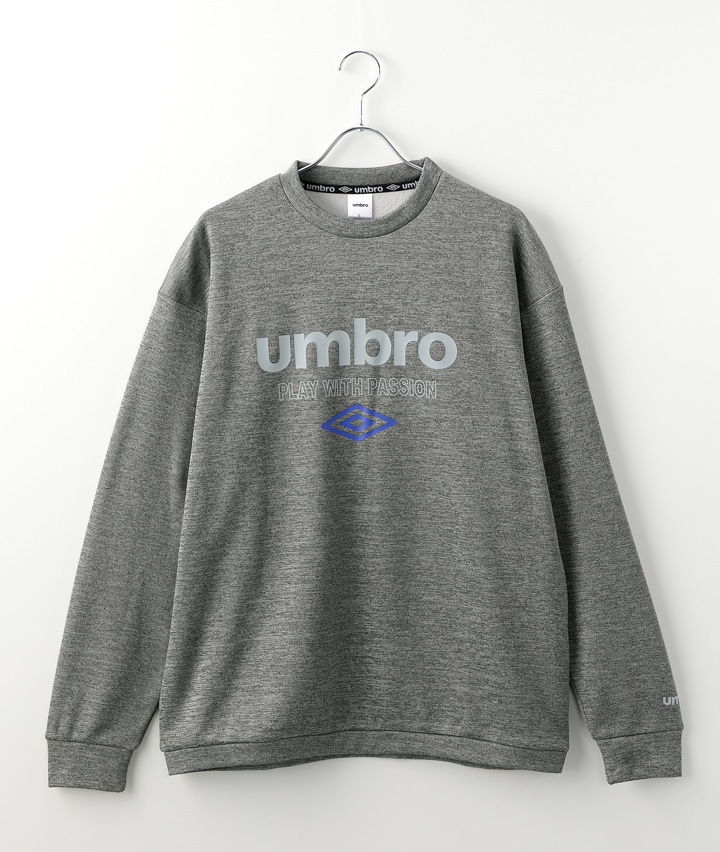 ・UMBROのトレーナーです。カチオン杢の生地にブランドロゴのプリントがポイントです。裏地は裏起毛であたたかい機能があります。