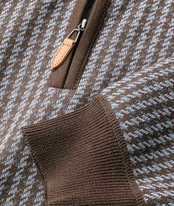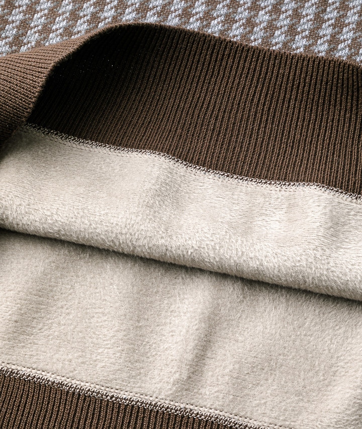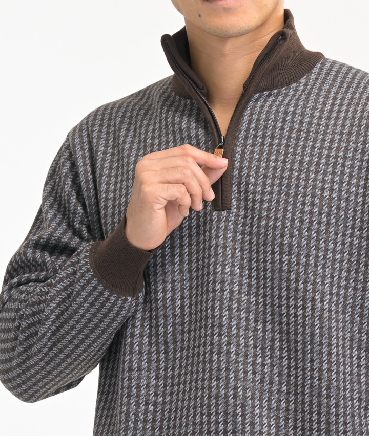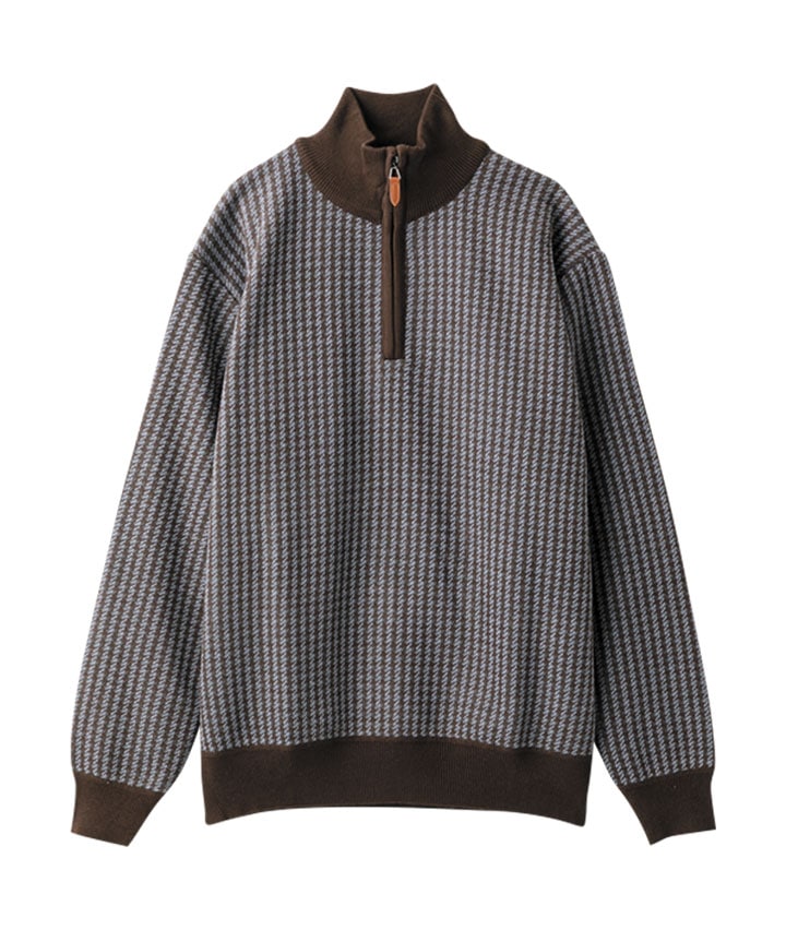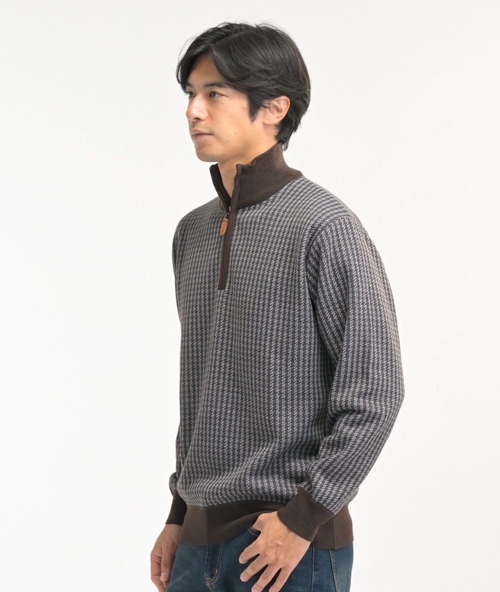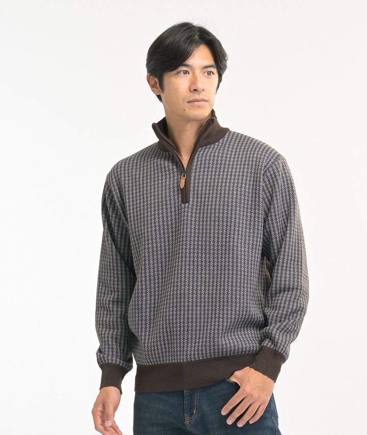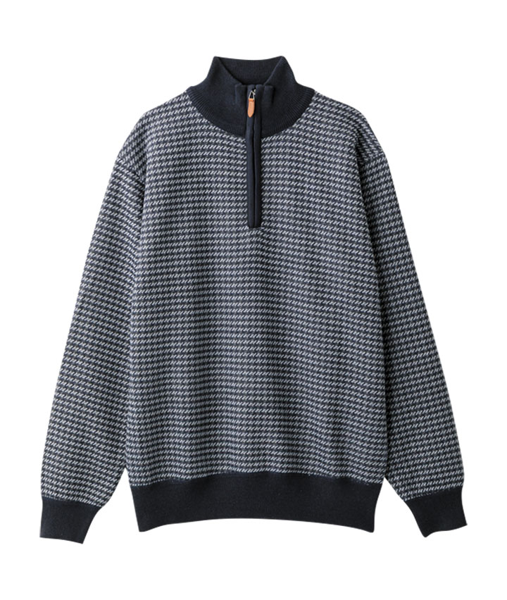 ・ジャガード柄の裏シャギーをボンディングしたハーフジップニット。 落ち着いた千鳥格子柄で合わせやすく、裏生地がシャギーでとても肌触りもよく風を通しにくいのでちょっとしたお出かけにも温かくて最適です。