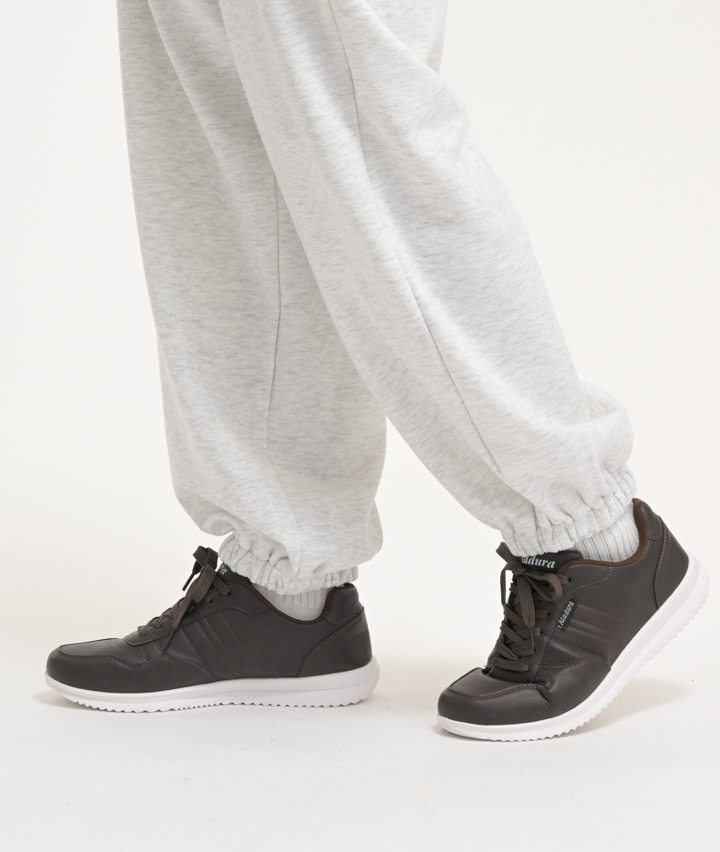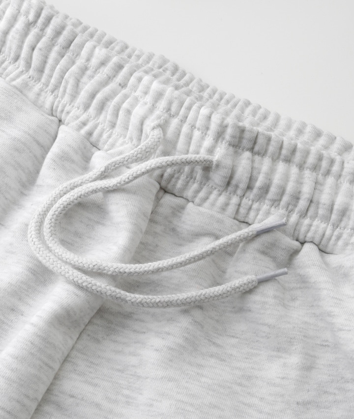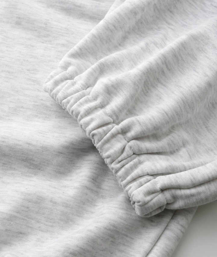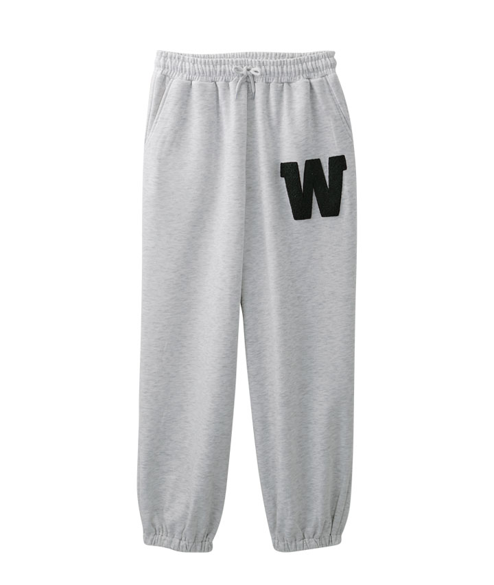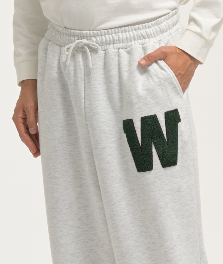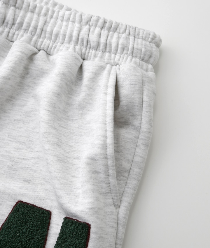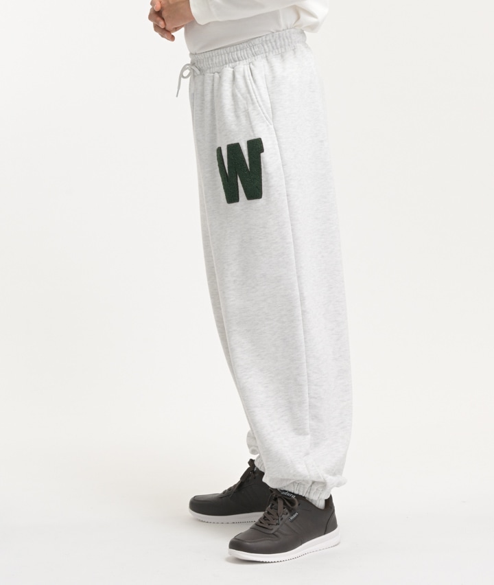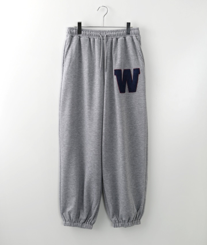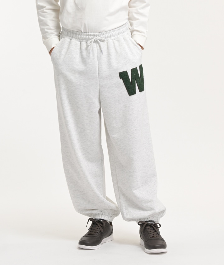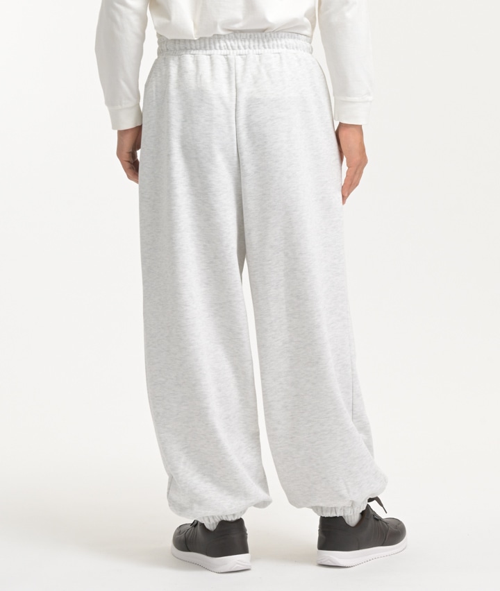 ・裏毛素材のスウェットパンツ、大きめのシルエットとサガラ刺繍がポイント。