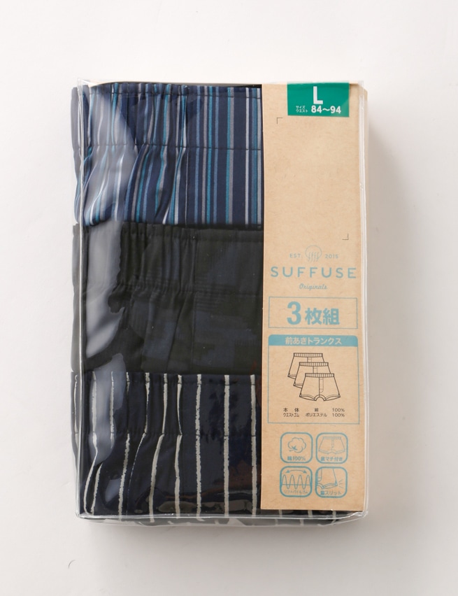 ・※前開き商品です。パシオスオリジナルスタイル【SUFFUSE】より、肌に優しい綿100%素材の3枚組トランクスのご紹介です。①ソフトパイルゴム使用②前開き③底マチ付④綿100%⑤脇スリット入り、こだわりの5つの快適仕様が特徴の履き心地にこだわったオススメの商品です。