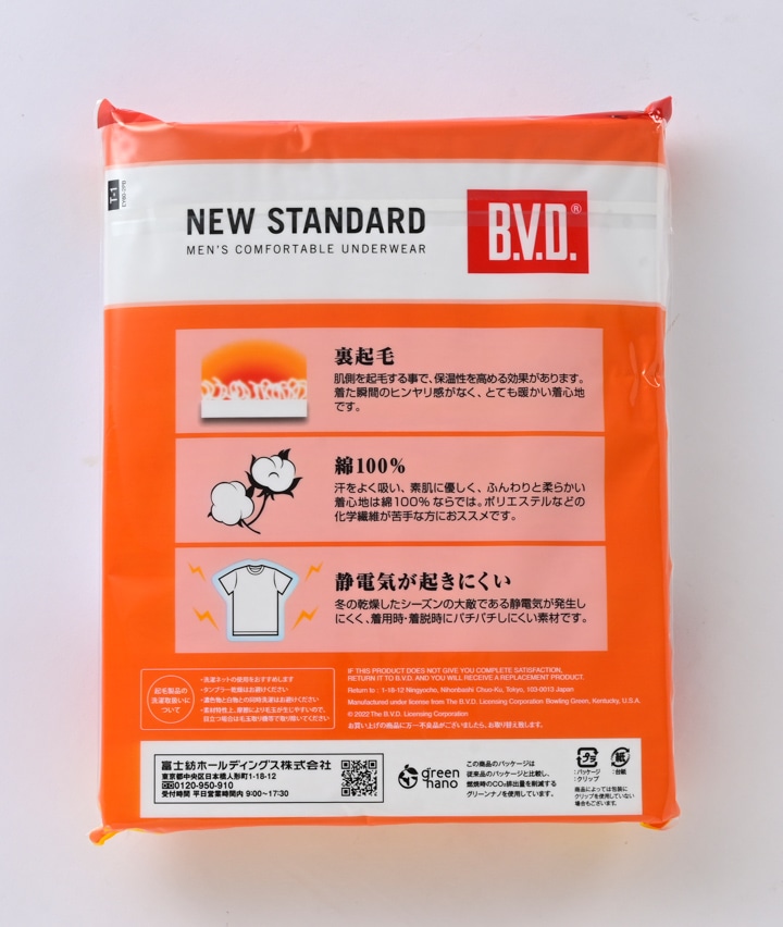 【BVD】【NEW STANDARD】(裏起毛)(綿100%)(保温)(フライス編み)(2枚組)長袖V首Tシャツ
