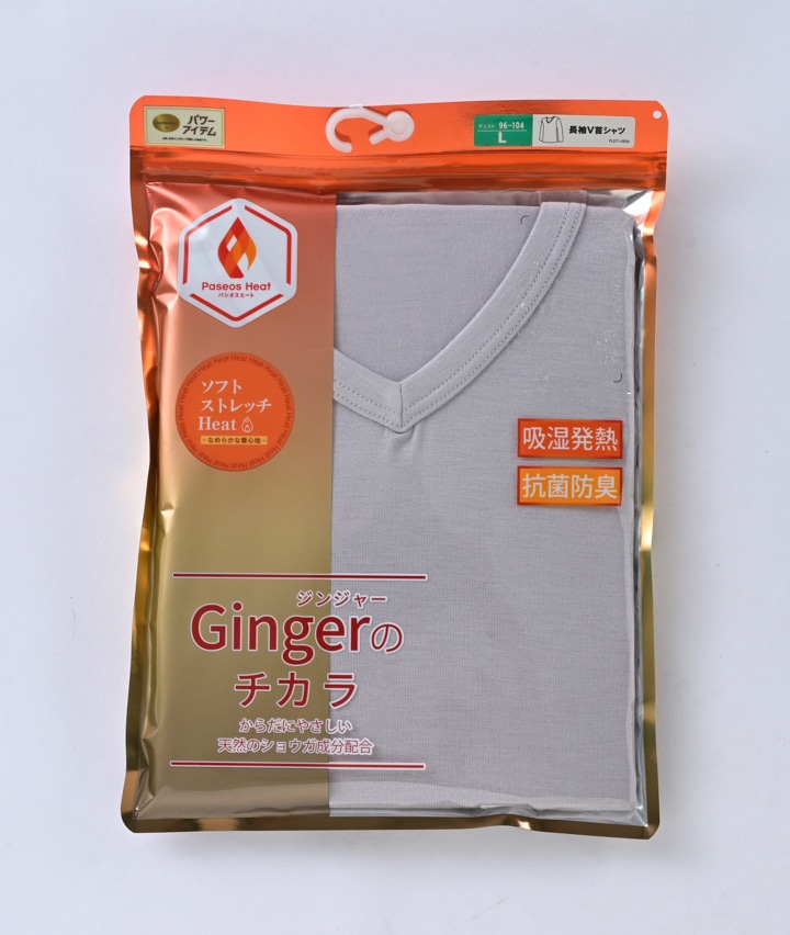 ・~からだにやさしい天然のショウガ成分配合~パシオスの【Gingerのチカラ】のなめらかな着心地【ソフトストレッチHeat】インナーです。アクリルレーヨン素材を使用し、やわらかく心地よい肌触りです。吸湿発熱・抗菌防臭の機能性で暖かく細菌の増殖を抑制します。