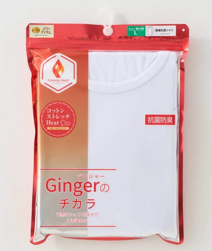 ・~天然のショウガ成分で体を温める~パシオスの【Gingerのチカラ】の肌に優しいあたたかさ【コットンストレッチHeat】インナーです。綿混・ストレッチ素材で肌に優しく、伸縮性があり体にほどよくフィットします。吸湿発熱・抗菌防臭の機能性で暖かく細菌の増殖を抑制します。