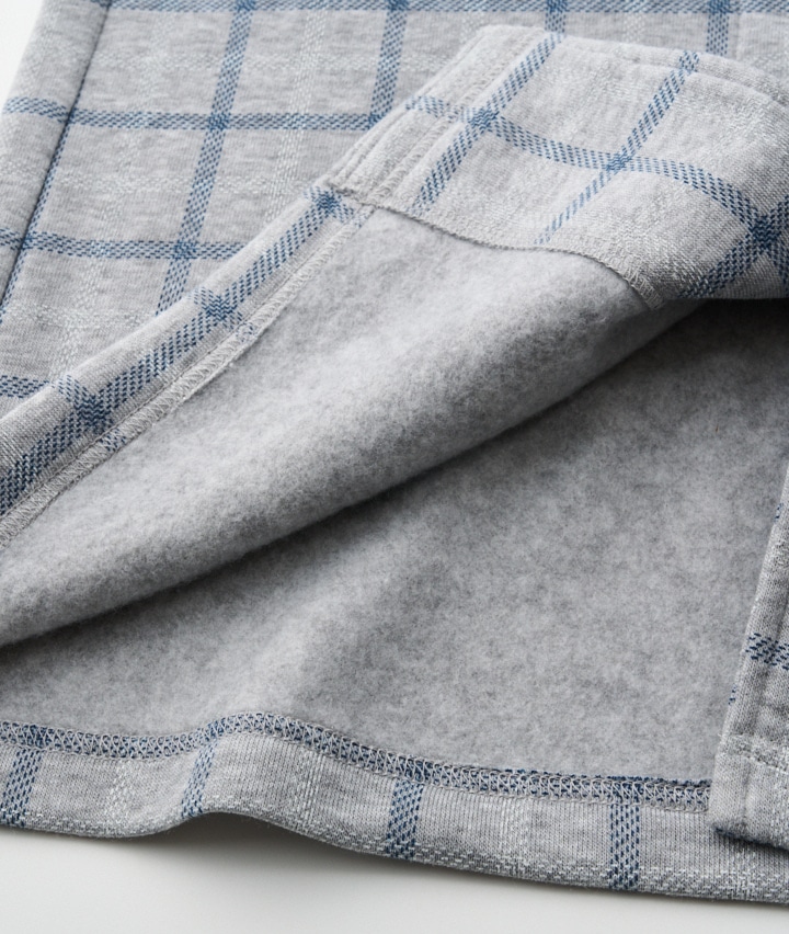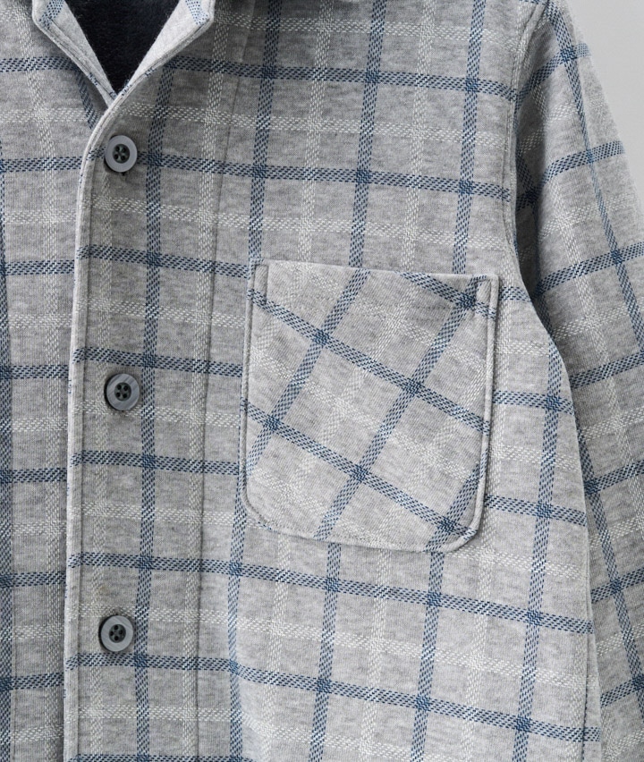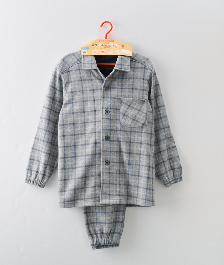 ・温活裏起毛あったかシャツパジャマ。背当て、腰当て部分はふわもこ生地を使用し、袖口とパンツ裾口がゴム仕様になっている暖かパジャマです。
