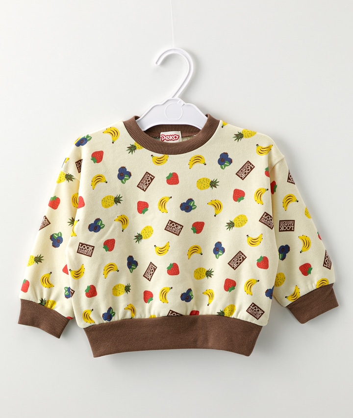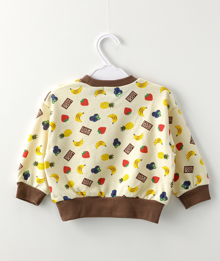 ・不二家のルックチョコレートの総柄プリントが可愛いトレーナーです。 チョコレート色の衿、裾、袖口の配色もポイントです。
