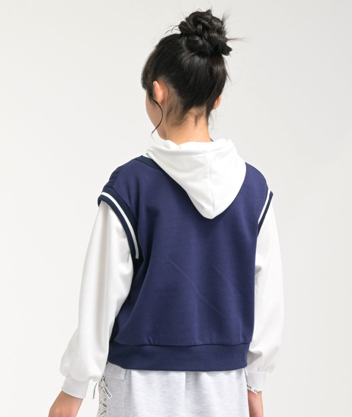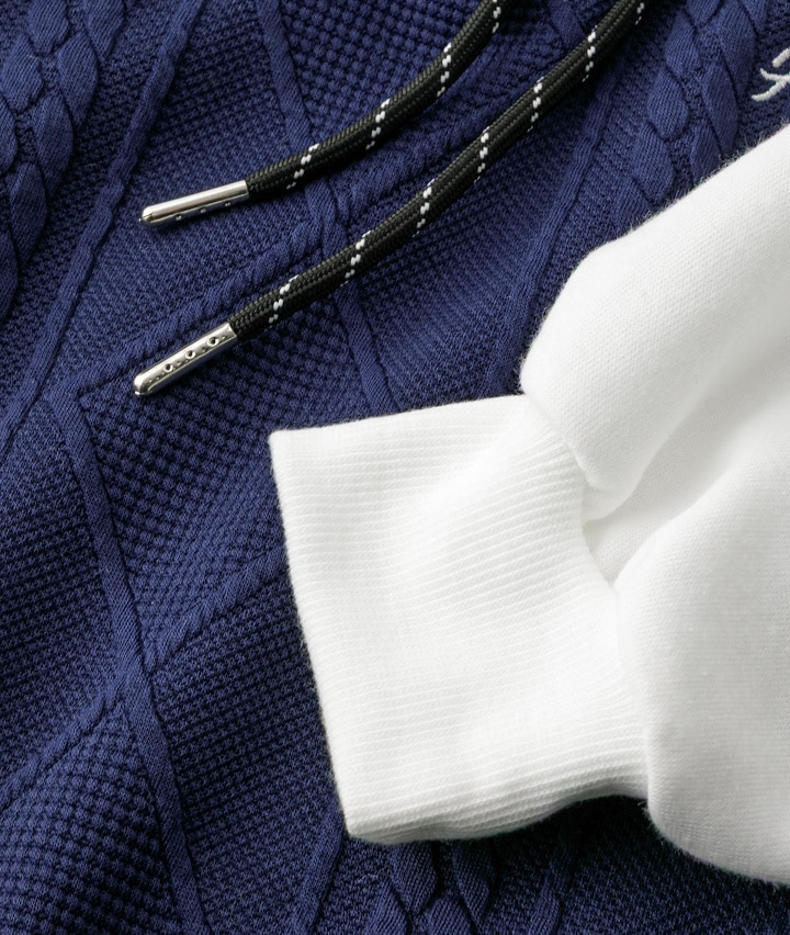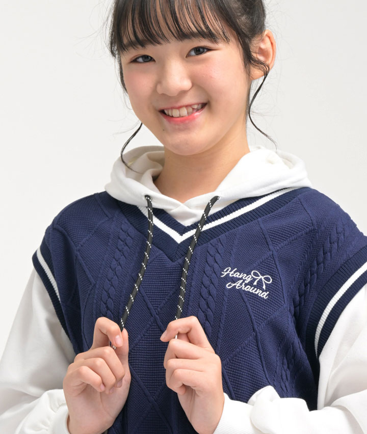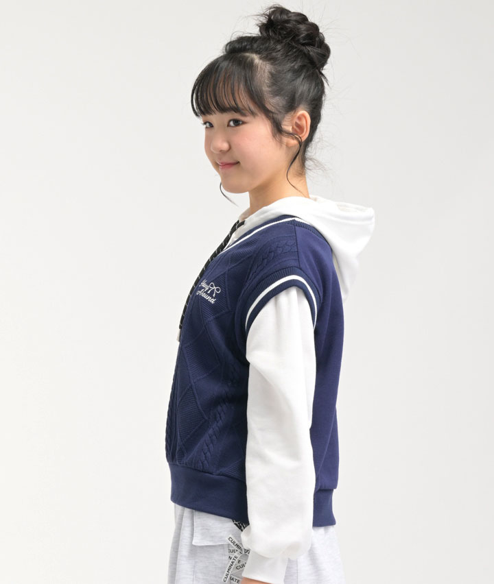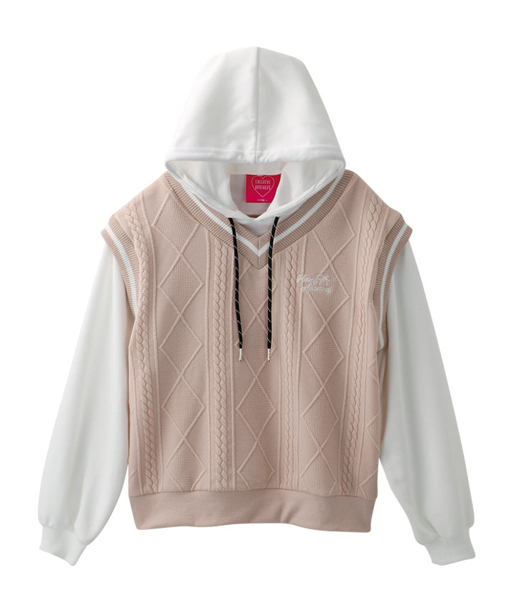 ・ケーブル柄トップスのレイヤード風デザインがかわいいプルパーカです。