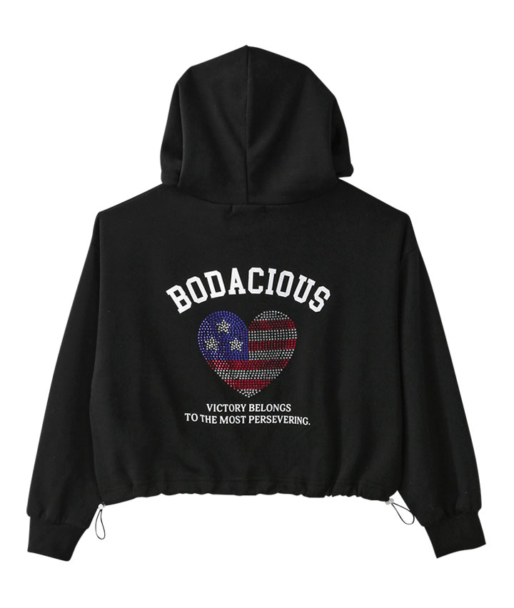・後身のハート型のラインストーン目を引くプルパーカーです。裾のドローコードを絞ってシルエットを変えて楽しめます。