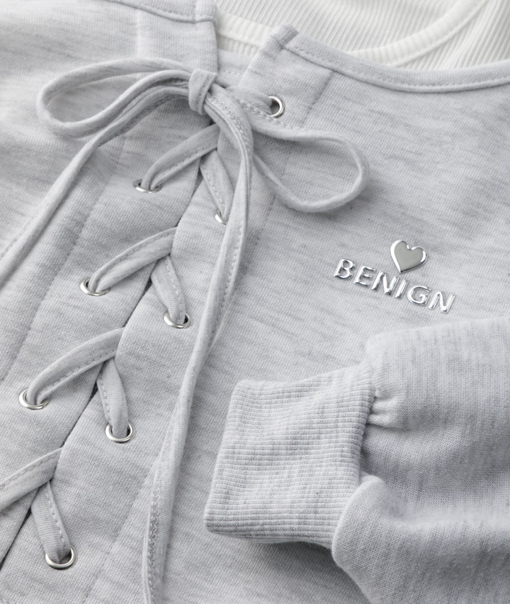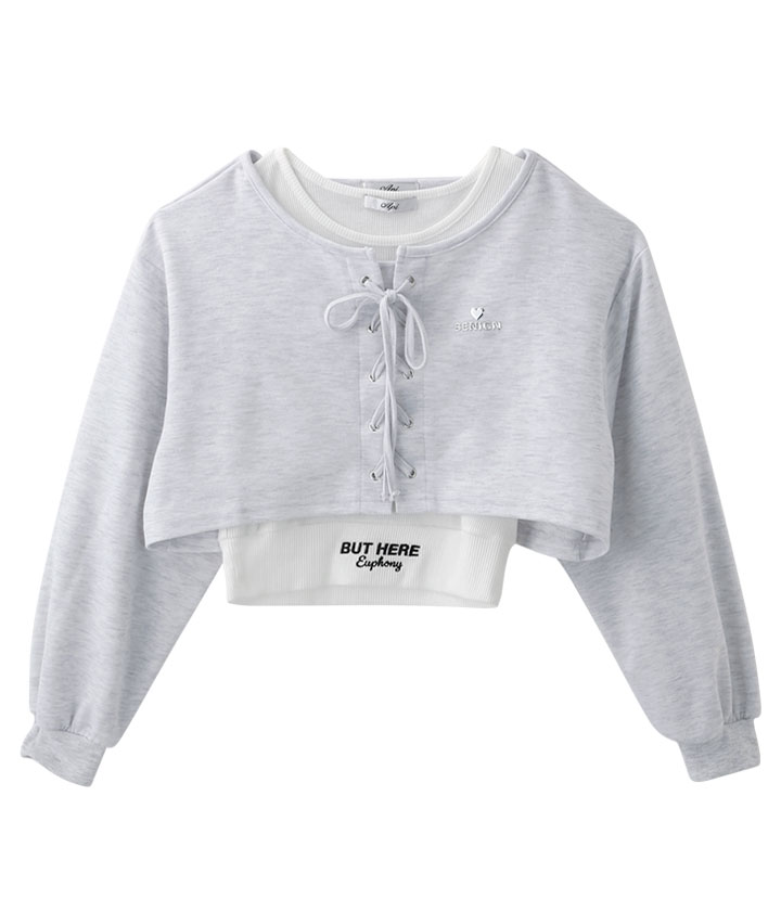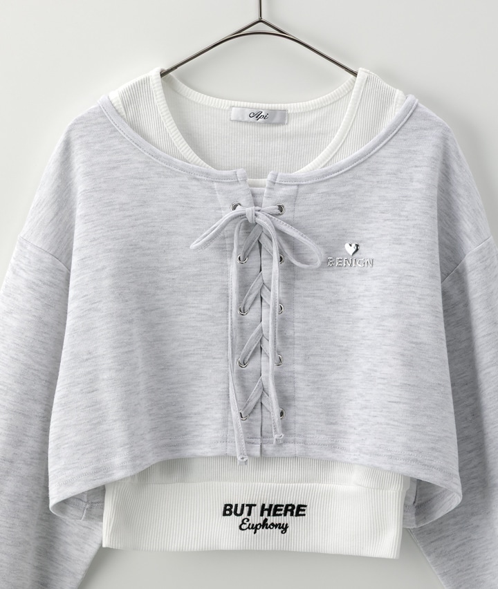 ・フロントのレースアップがポイントのショート丈プルオーバーとリブタンクトップのセットです。