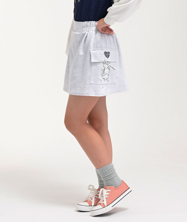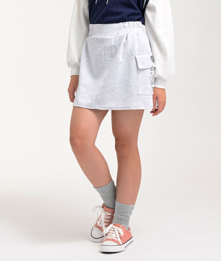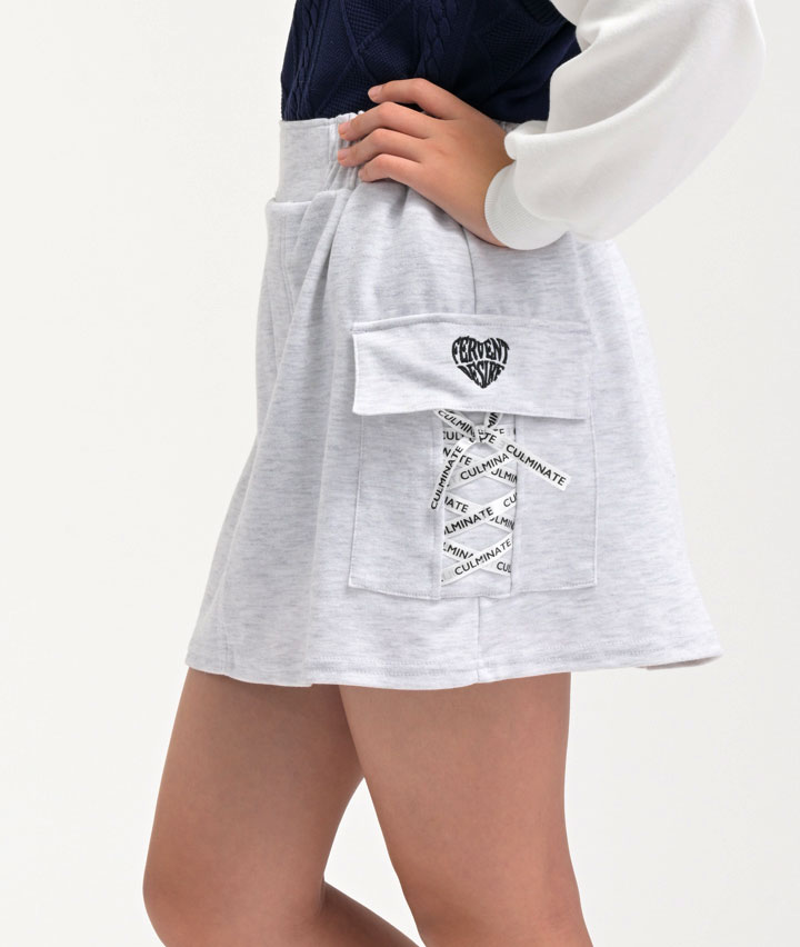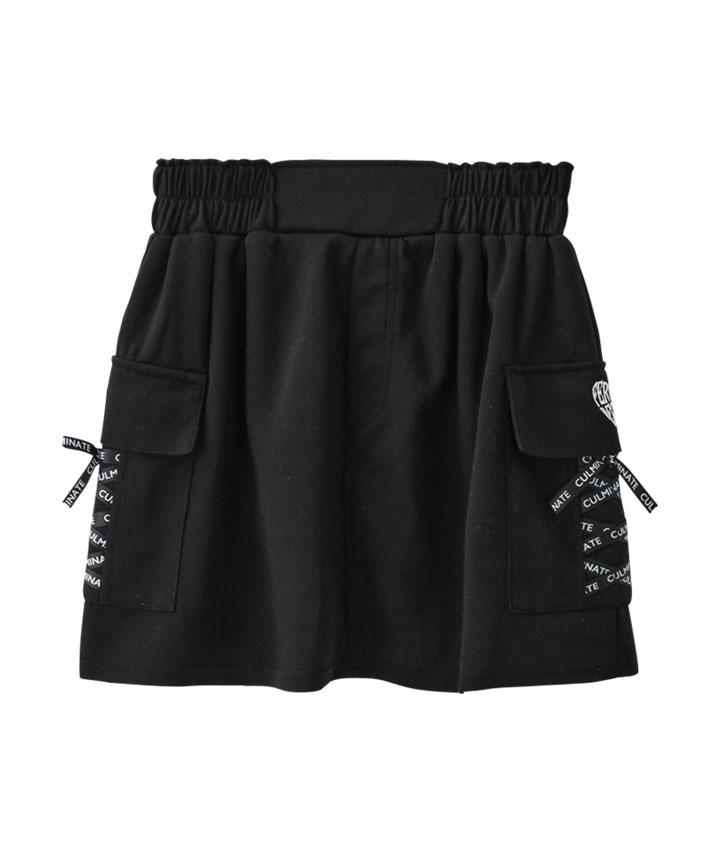 ・カーゴポケットのレースアップリボンが目を引く、やわらかいカットソー素材のスカートです。パンツ仕様に裏地付きでアクティブに動いても安心です。