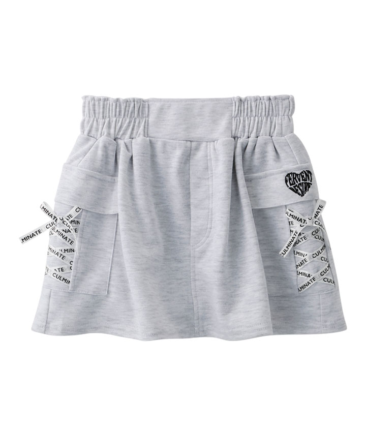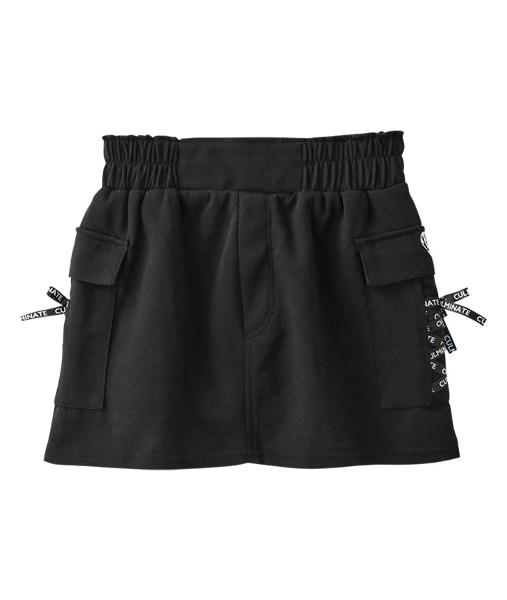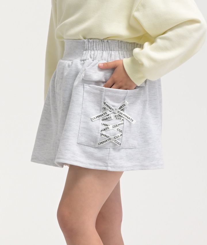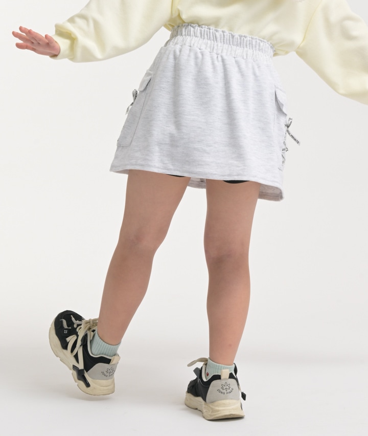 ・カーゴポケットのレースアップリボンが目を引く、やわらかいカットソー素材のスカートです。パンツ仕様に裏地付きでアクティブに動いても安心です。