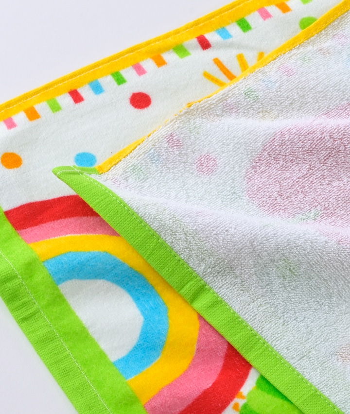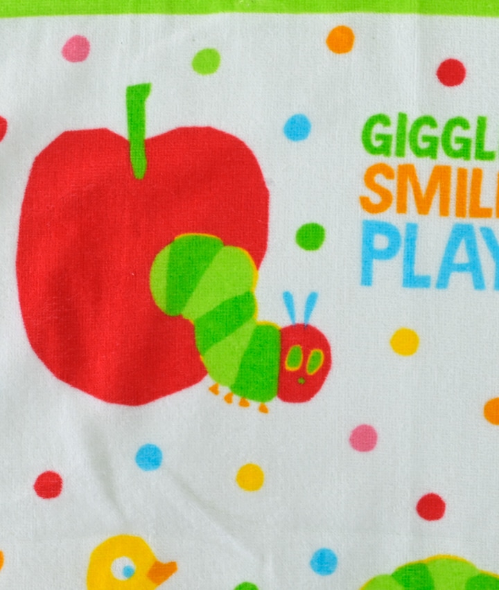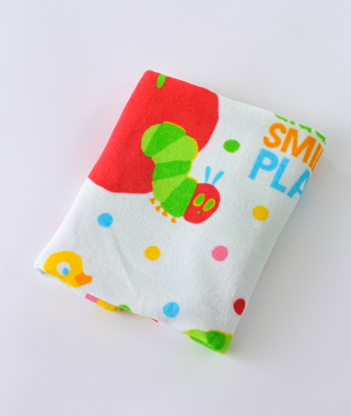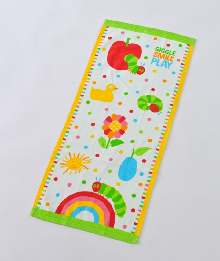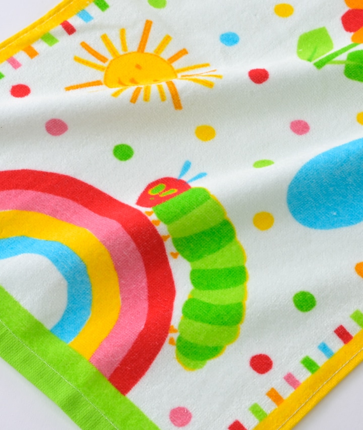・大人気絵本の『はらぺこあおむし』のタオルです。表面のパイルをカットした、なめらかな手触りな生地を使用。