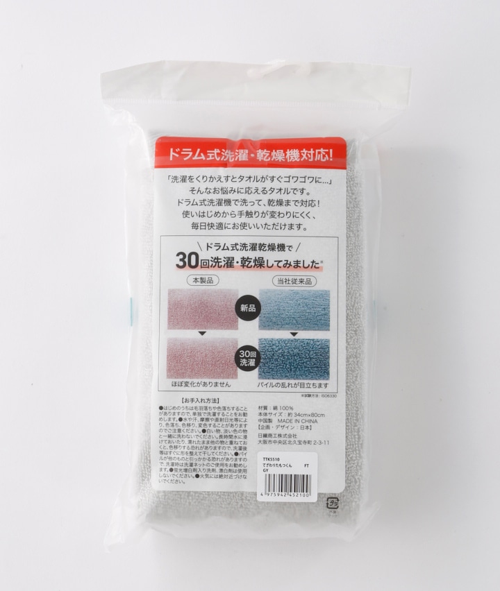 ●色落ち、色移りする事がありますので、他の物とは別にお洗い下さい。また、濡れたまま放置しないで下さい。●塩素系漂白剤は使用しないで下さい。●毛羽落ちやパイル抜けしやすくなりますので、柔軟剤のご使用はお避け下さい。●毛羽立ちたパイル抜けを防ぐため洗濯ネットのご使用をお勧めします。●商品の特性上、多少の糸抜けや毛羽落ちがありますので、くず取りネットをご使用下さい。