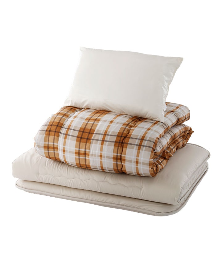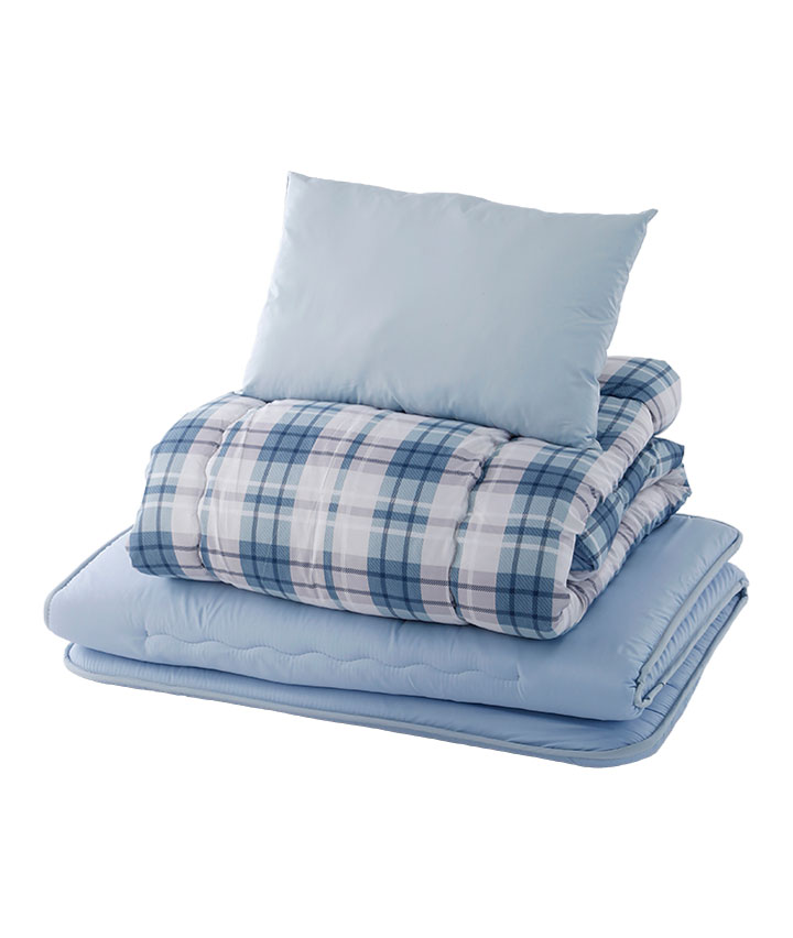 ・チェック柄の3点set組布団。明るいカラーリングが、お部屋を演出します。