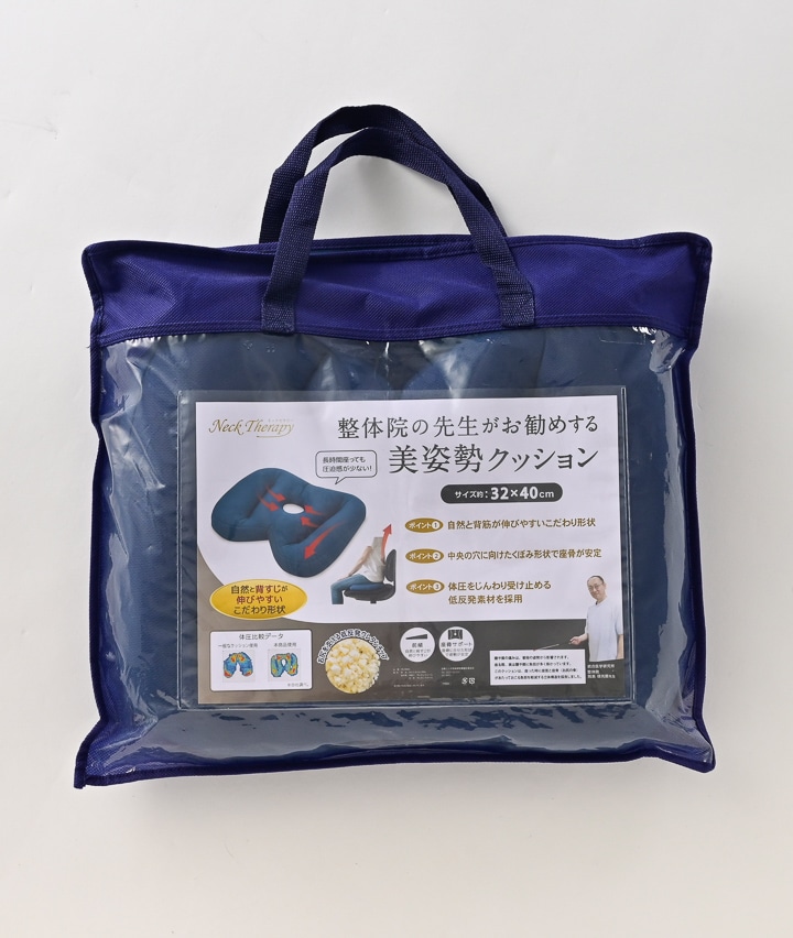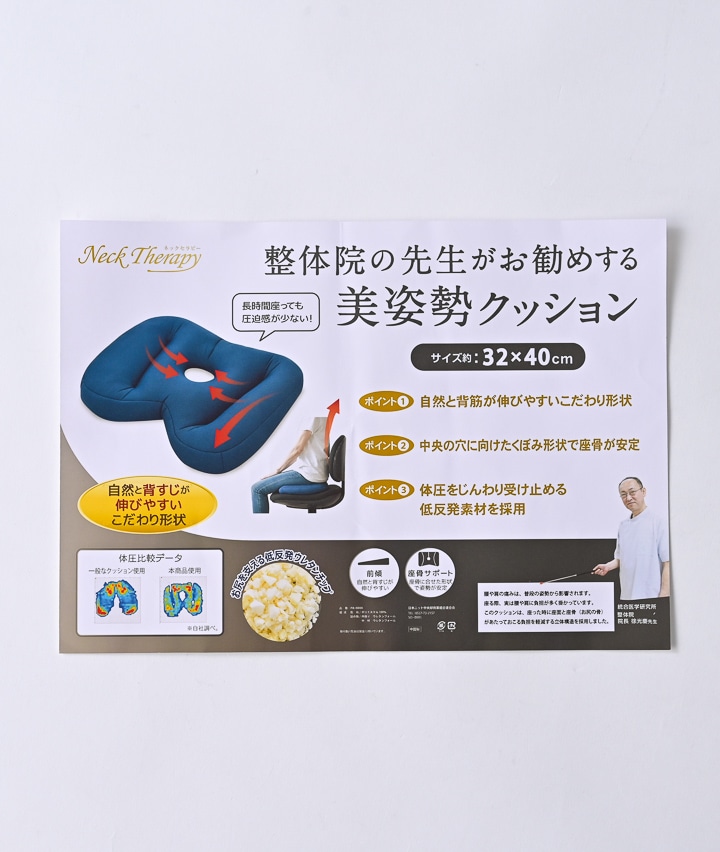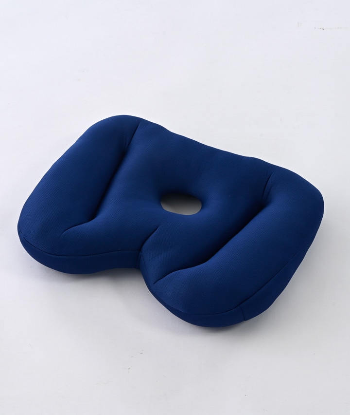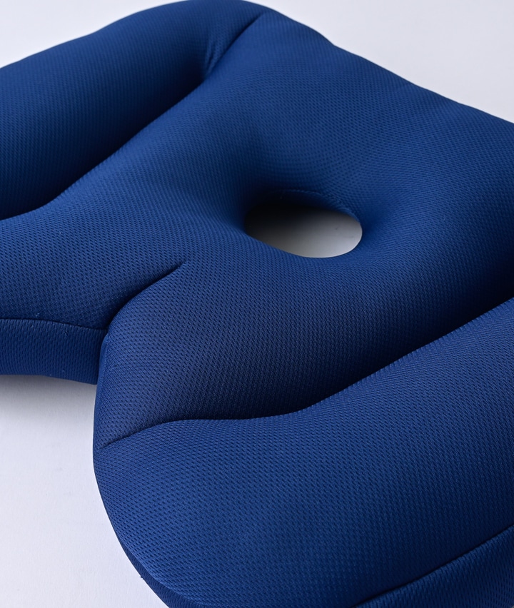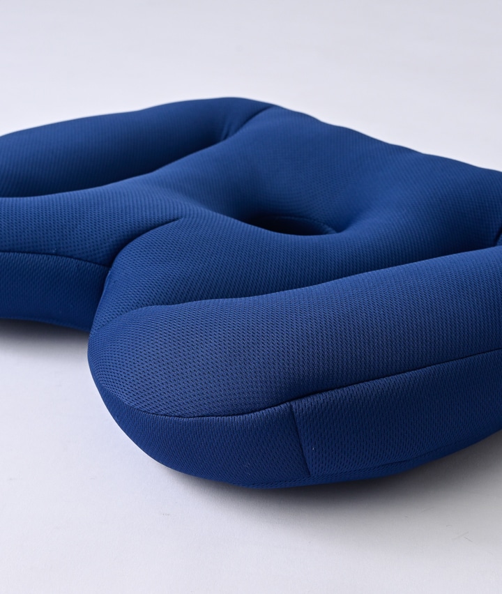 ・自然と背すじが伸び、美しい姿勢をサポートする整体院推奨クッション。こだわりの形状が背筋を伸ばしやすく、中央のくぼみが骨盤をしっかり安定。低反発素材が体圧をやさしく分散し、長時間座っても圧迫感が少なく快適です。