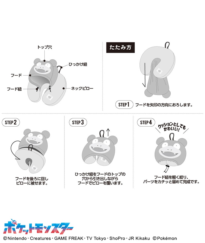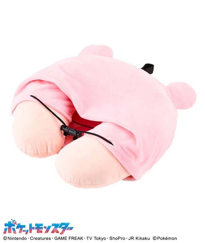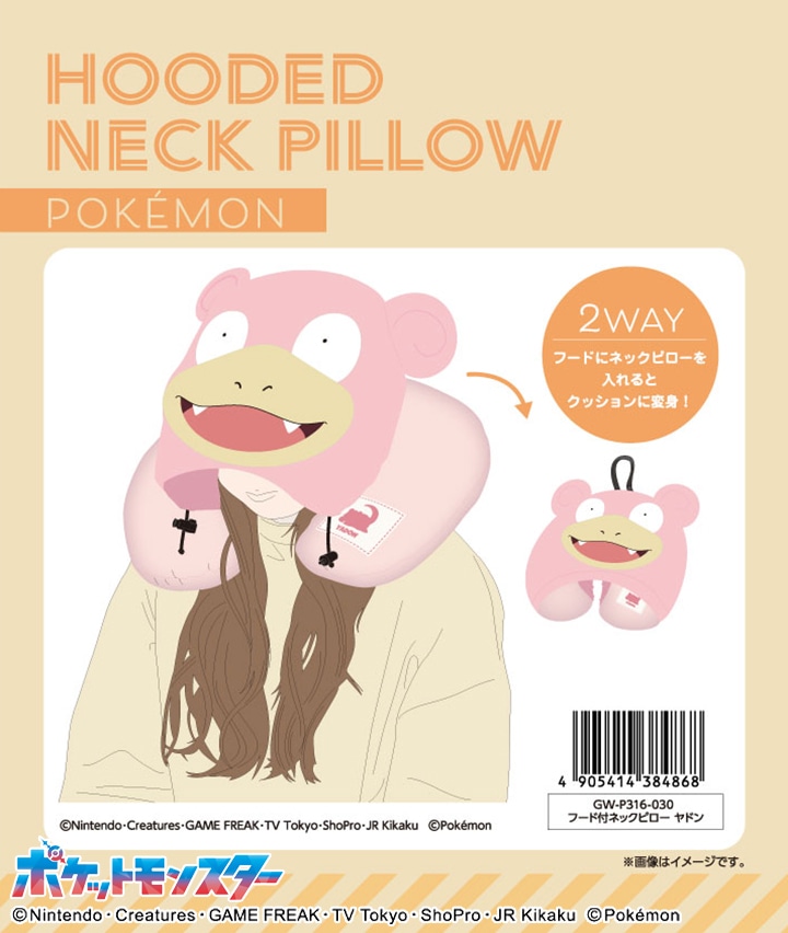 ・フードをかぶるとヤドンになりきれるフード付ネックピローです。ネックピローは綿がしっかりと入っていて、フリース素材が気持ちよくふかふかなので、長時間の移動も快適に過ごせます!