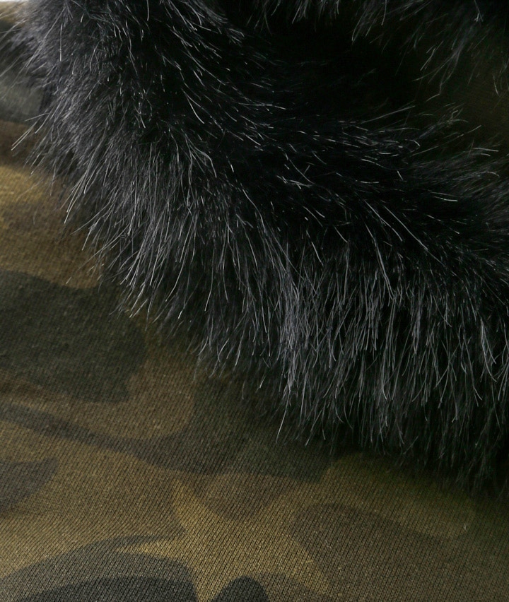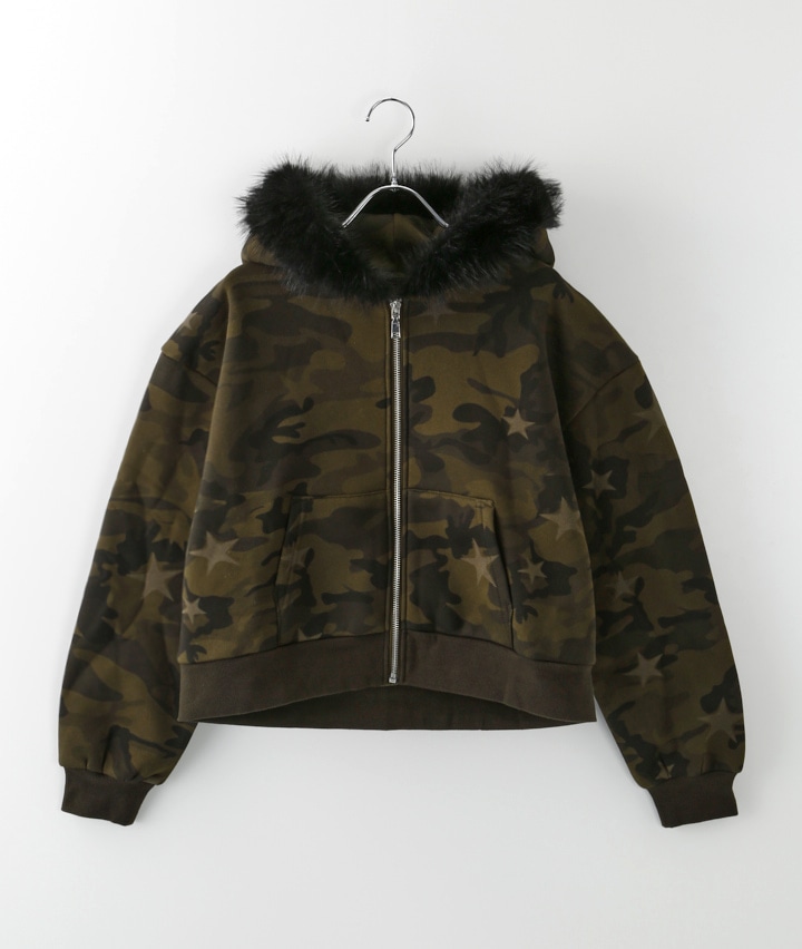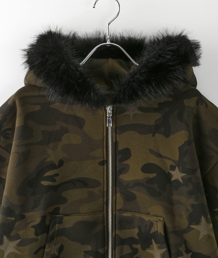 ・星迷彩カラーでフードにファーが付いているパーカーです。