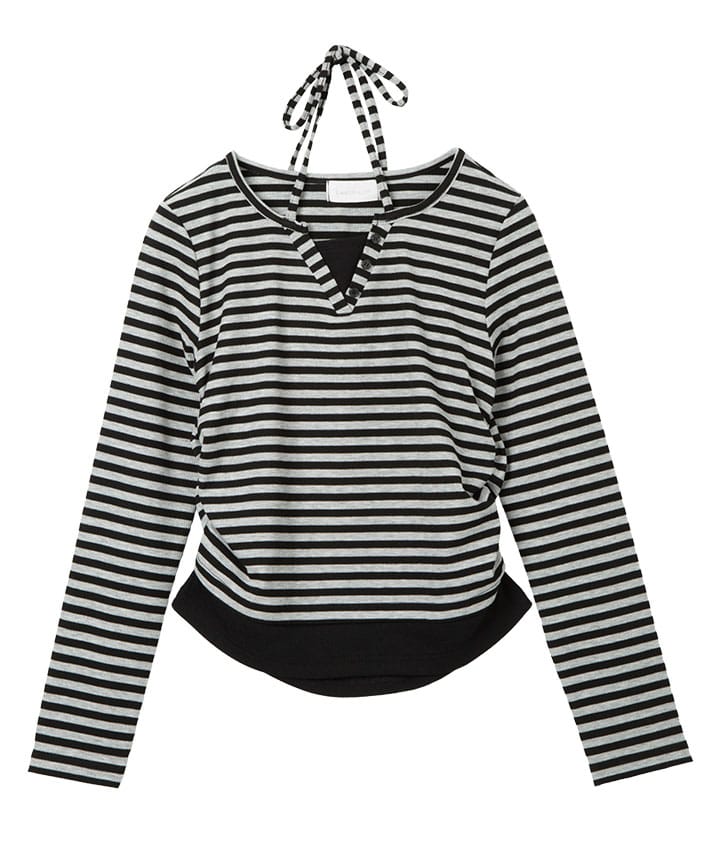 ・クロスネックがポイントのボーダー長袖トップス。