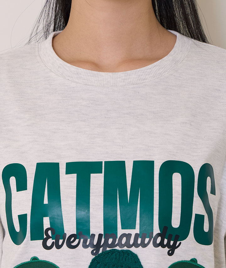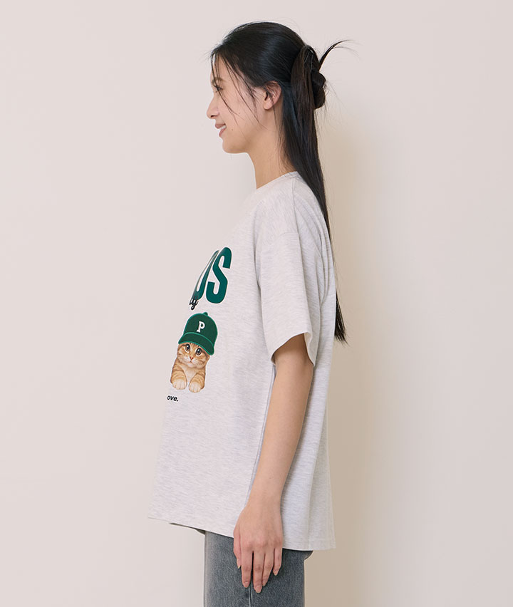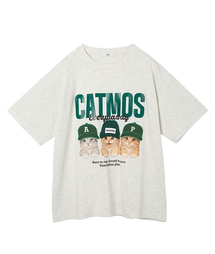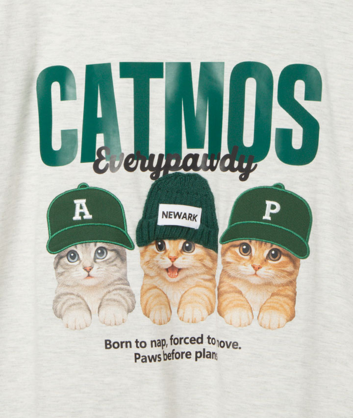 ・帽子が貼り付けされた立体感のあるデザイン。ネコが3匹プリントされたTシャツ。