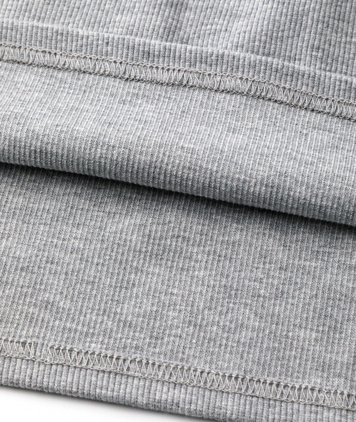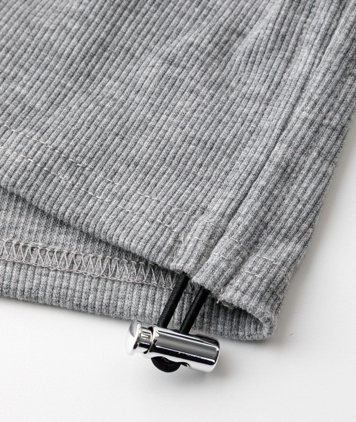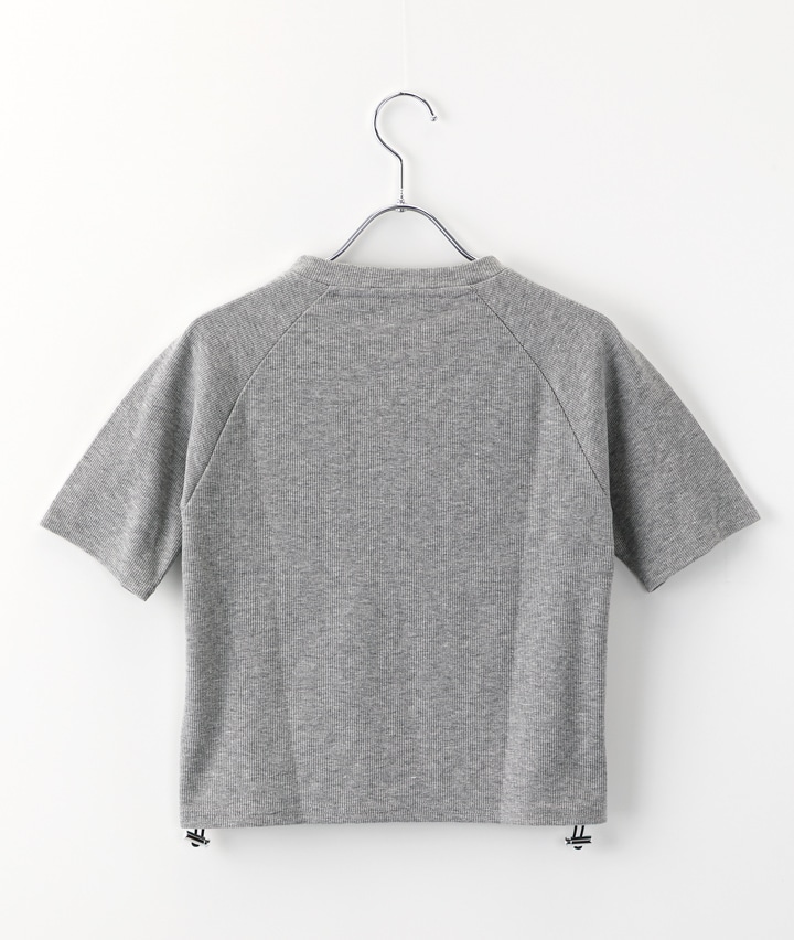 ・スナップボタンのヘンリーネックがポイントのロゴトップス。サイドにドロストデザインをほどこし、絞りぐあいによってシルエットを変化できます。