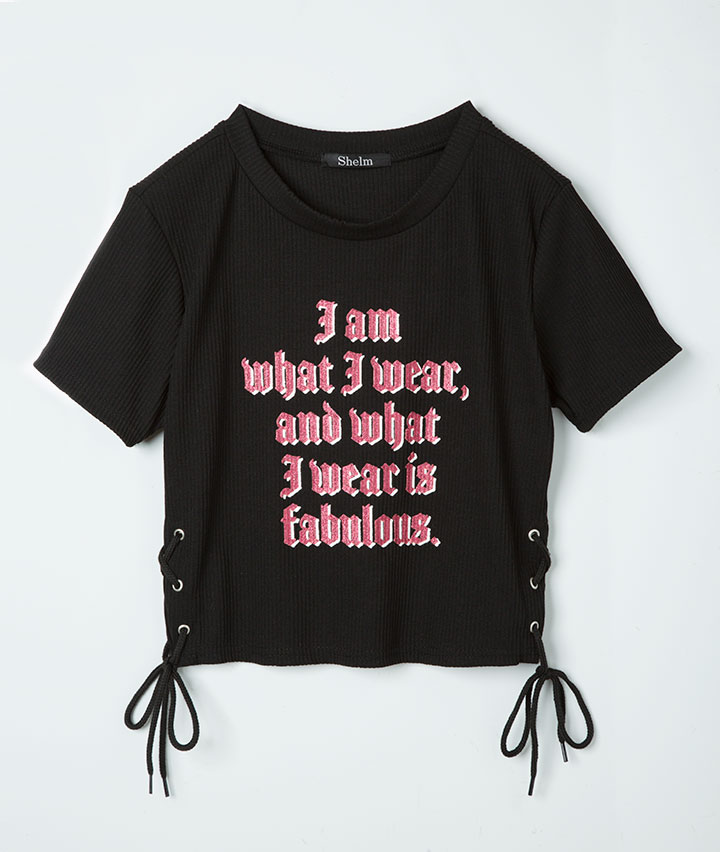 ・サイドリボンのリブTシャツ。ブラックレターのラメロゴが人気のポイントです。