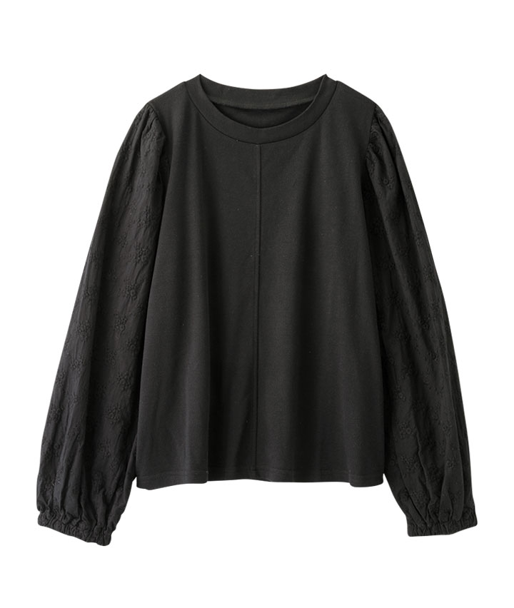 ・袖に表情豊かなレースをあしらったプルオーバー。身頃はTシャツ素材、袖はレース素材の異素材使いで、360度どこから見ても可愛いこだわりのデザインです。