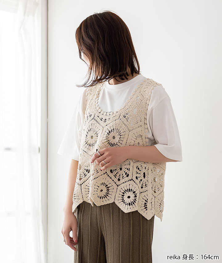 ・Tシャツを合わせて流行りのレイヤードスタイル。クロシェで可愛く、ナチュラルにもカジュアルにも合わせられます。