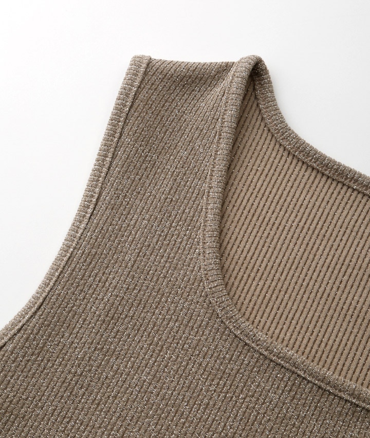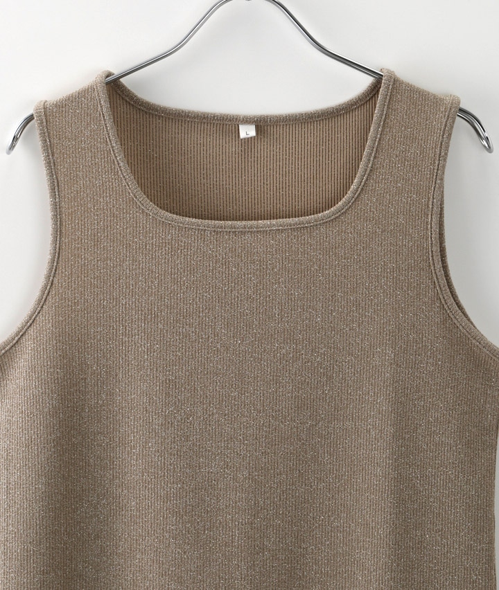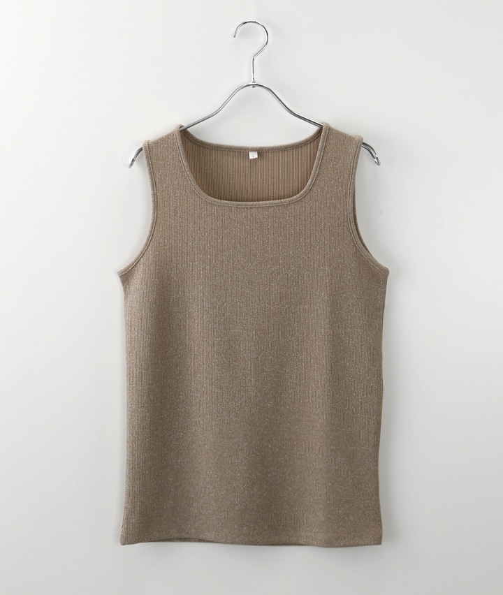 ・デコルテを美しく開放的に見せる、直線的なラインが特徴のスクエアネック。清潔感のあるオフホワイト、落ち着いた印象のブラウン、そして程よい華やかさを添えるラメ入りベージュ。一枚で着ても「肌着感」がなく、シアートップスのインナーとしても大活躍間違いなし。
