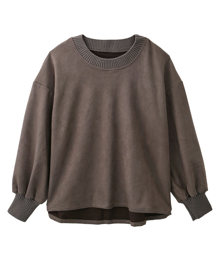 ・スウェードポンチ素材を使用した滑らかでハリのあるプルオーバーです。しっとりとした質感とほんのり光沢感のある生地がカジュアルな中にも上品な雰囲気を演出します。袖口、首元、裾のリブ切り替えがアクセントになっています。
