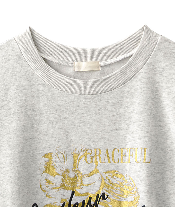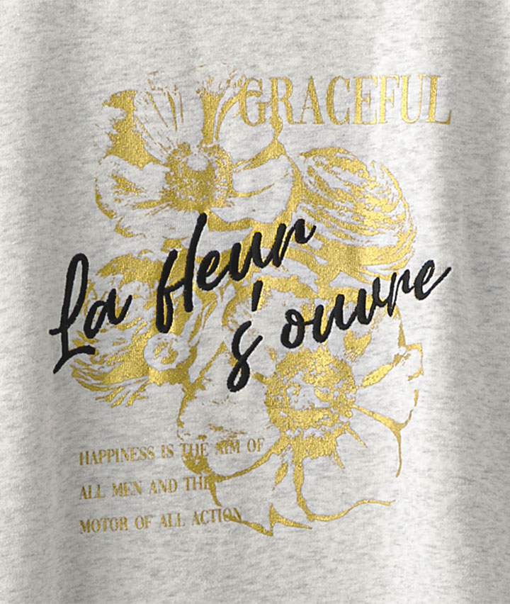 ・フロントに潔くプリントされたかすれ箔花デザインがこなれ感抜群。抜け感のあるビッグシルエットで体のラインも拾いません。