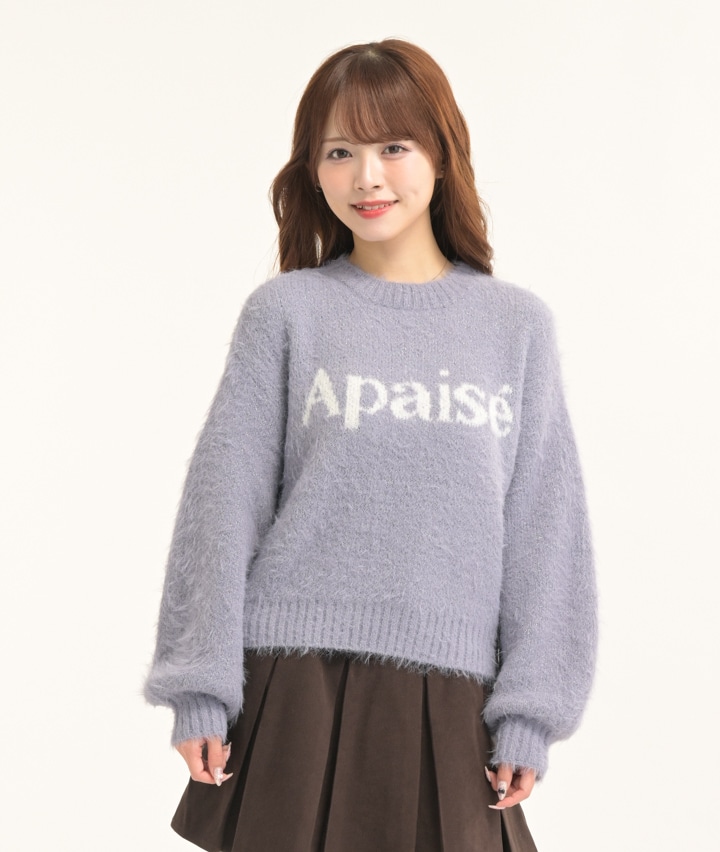 ・ふんわりフェザー素材のロゴニット。ボリューム袖が華やかな印象に。