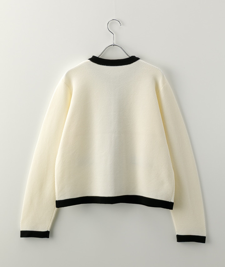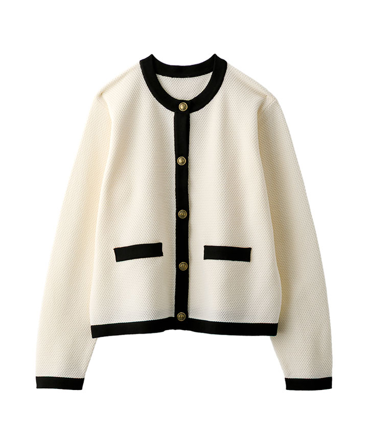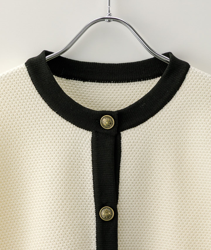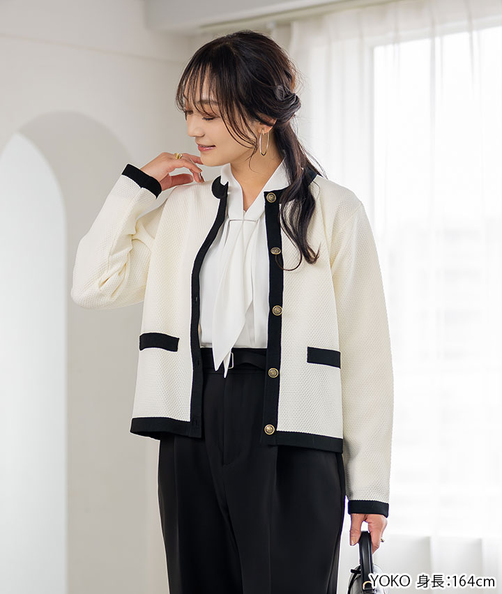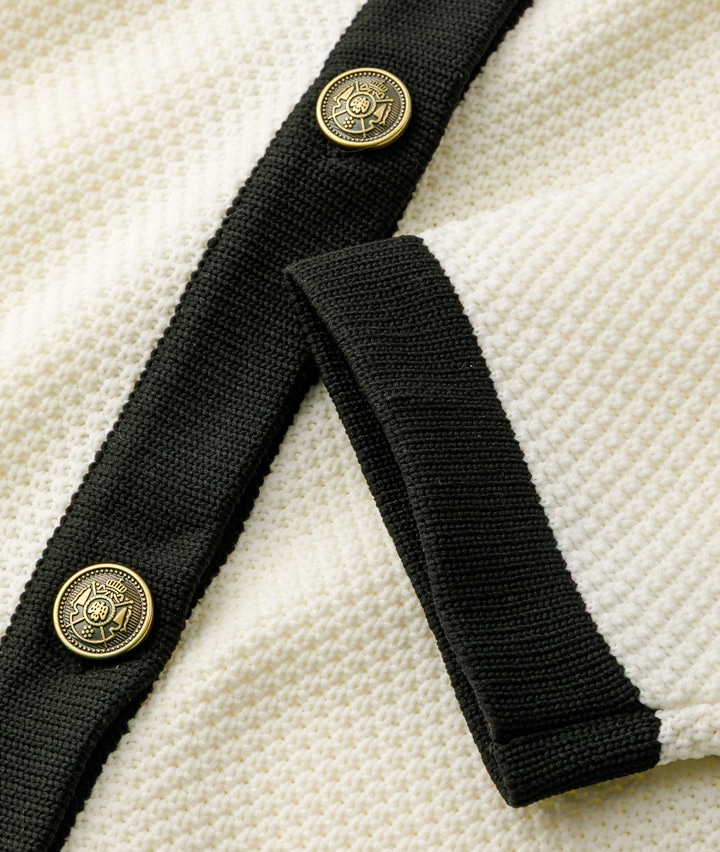 ・配色の入った金ボタンのニットジャケットオンのシーンにも着ていただけるアイテムでデニムに合わせてカジュアルにも着ていただけます。