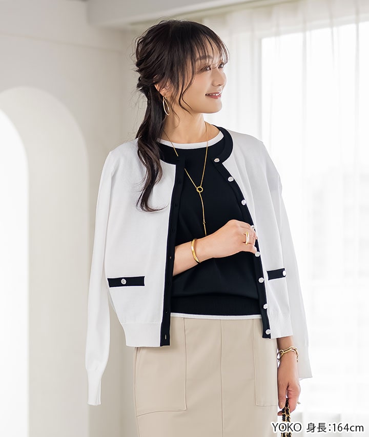 ・メタルのボタンを多くあしらった配色のカーディガン、ベーシックカーディガンとは差別化できおしゃれさを増す1着です。