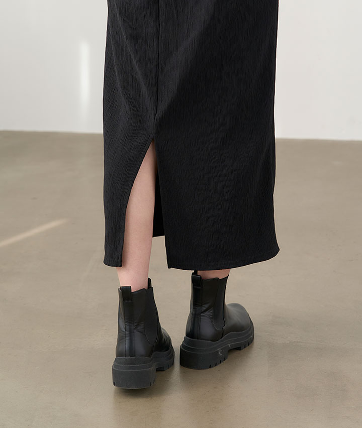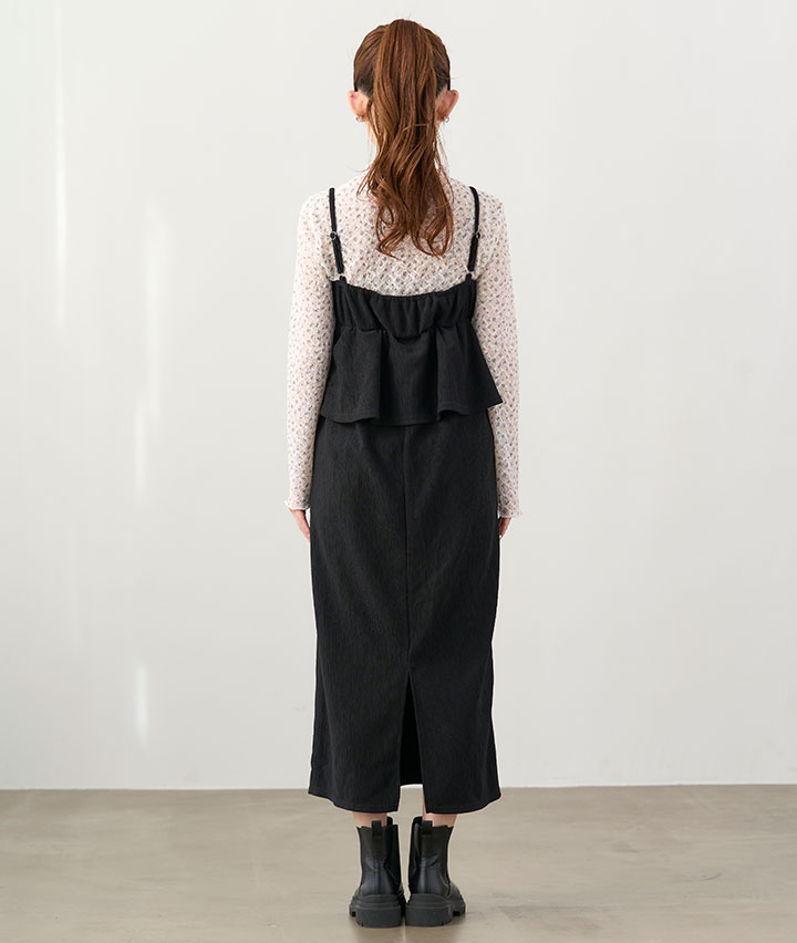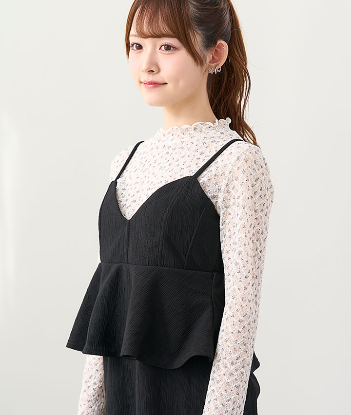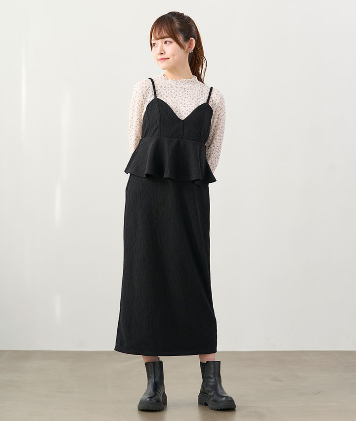 ・表面感のあるジャガード素材がポイントのキャミワンピース。ペプラムデザインで体系カバーも叶います。