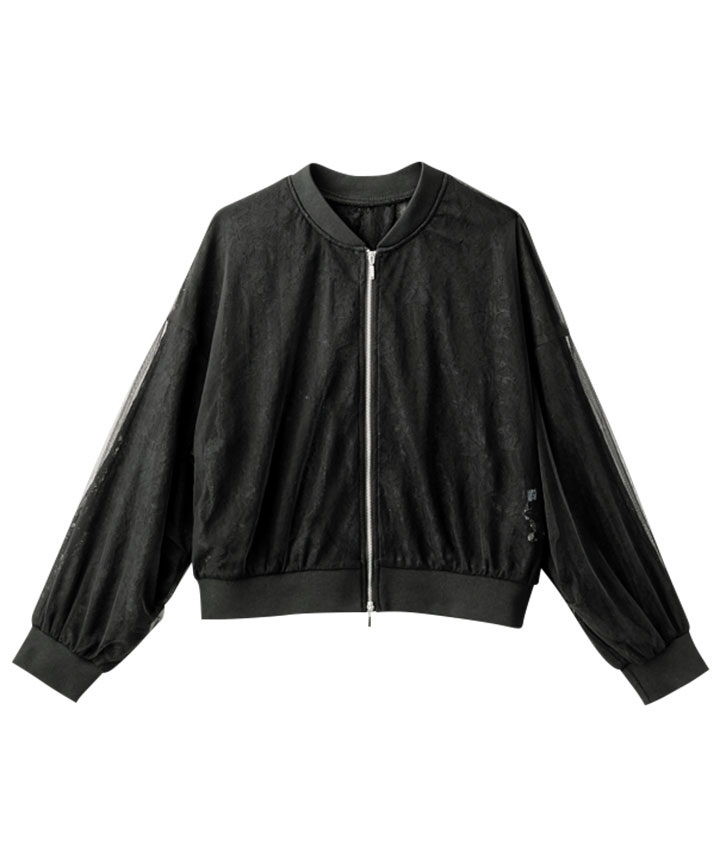 ・軽やかなチュール素材を重ねたデザインが特徴のアウター。カジュアルなブルゾンに透け感のあるチュールをプラスすることで、華やかさと女性らしさを引き立てます。