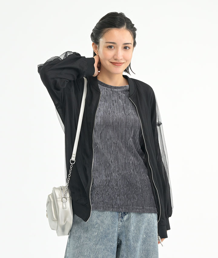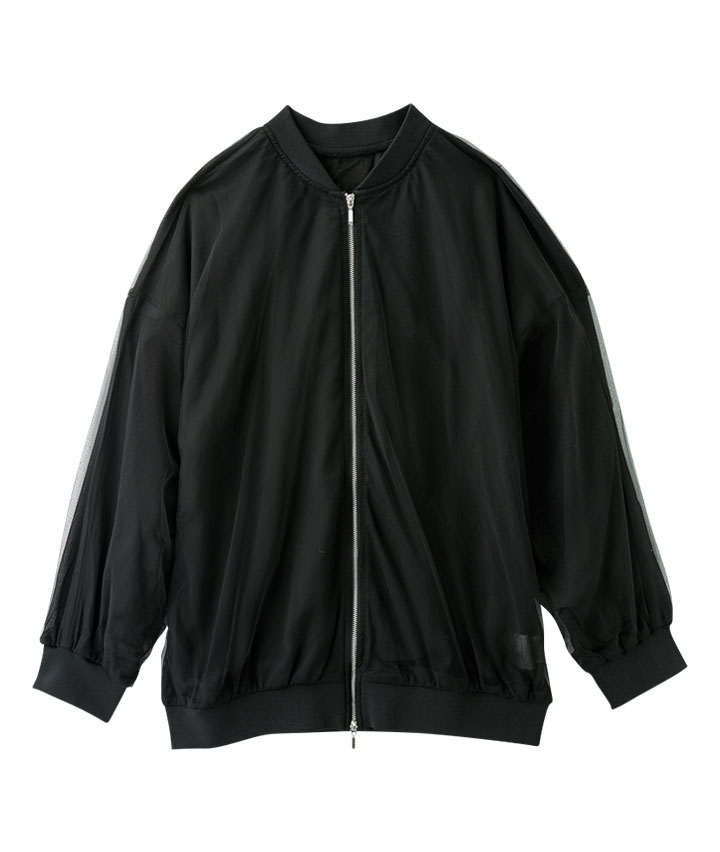 ・全体にチュールを重ねた立体感のあるブルゾン。程よいボリューム感で軽い着心地です。軽やかな素材がスタイリングに抜け感と女性らしさをプラスしてくれます。