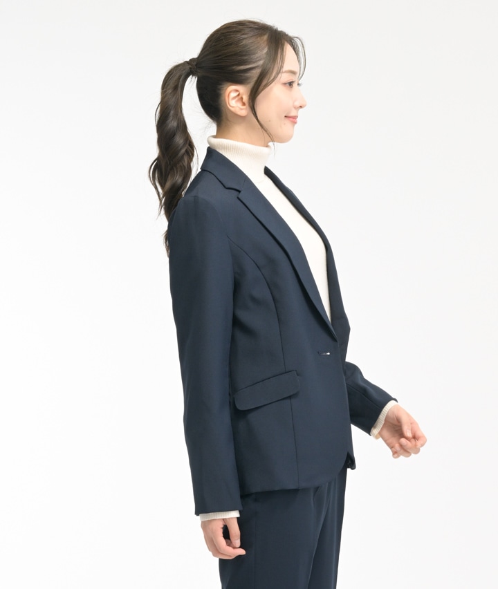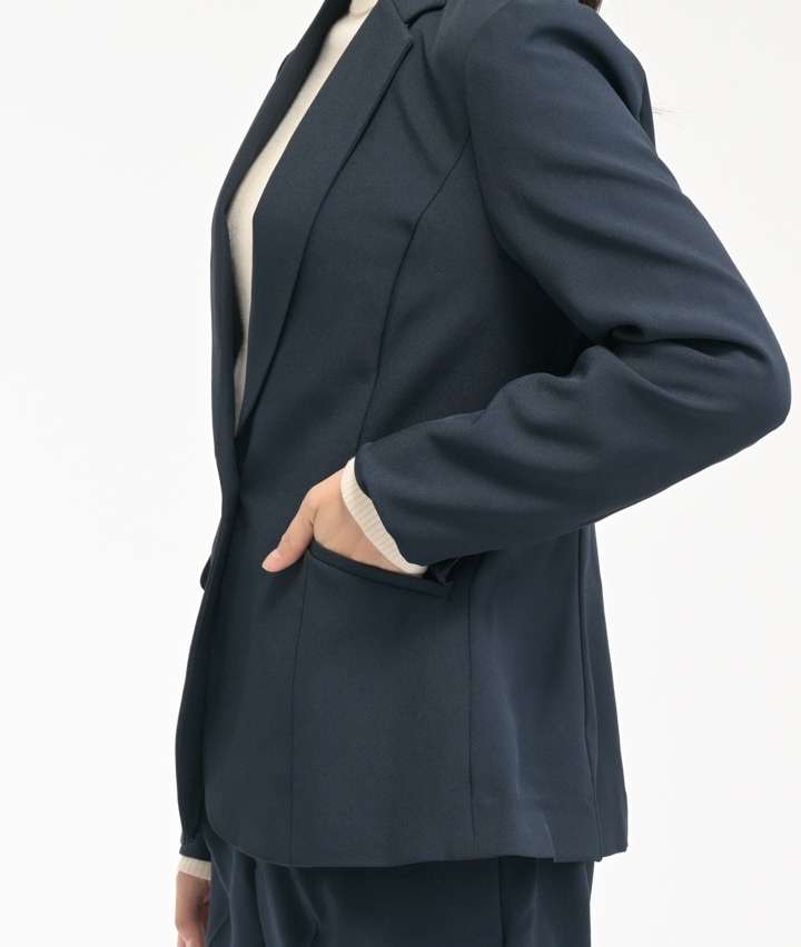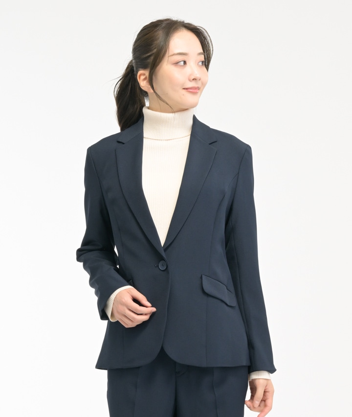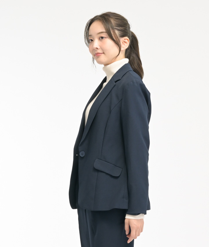 ・ストレッチの効いた動きやすさを備えたジャケットです。セットアップはもちろん、1枚でもコーディネートできるシンプルジャケットはパンツにもスカートにも合わせられます。