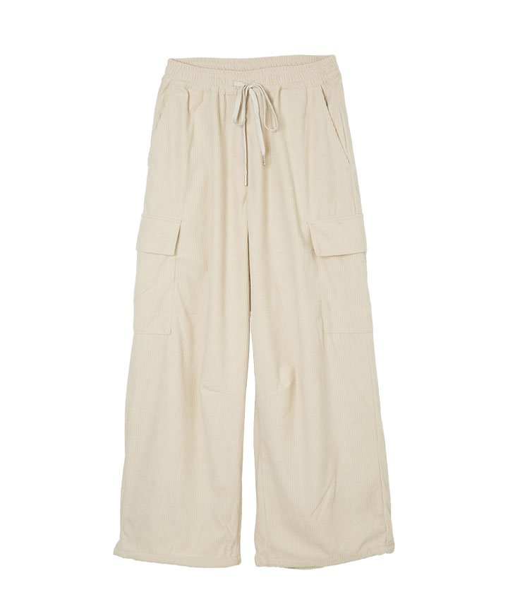 ・コーデュロイ素材のカーゴパンツ。ウエストゴムで履きやすく、裾が絞れて気分で変える2WAY仕様です。