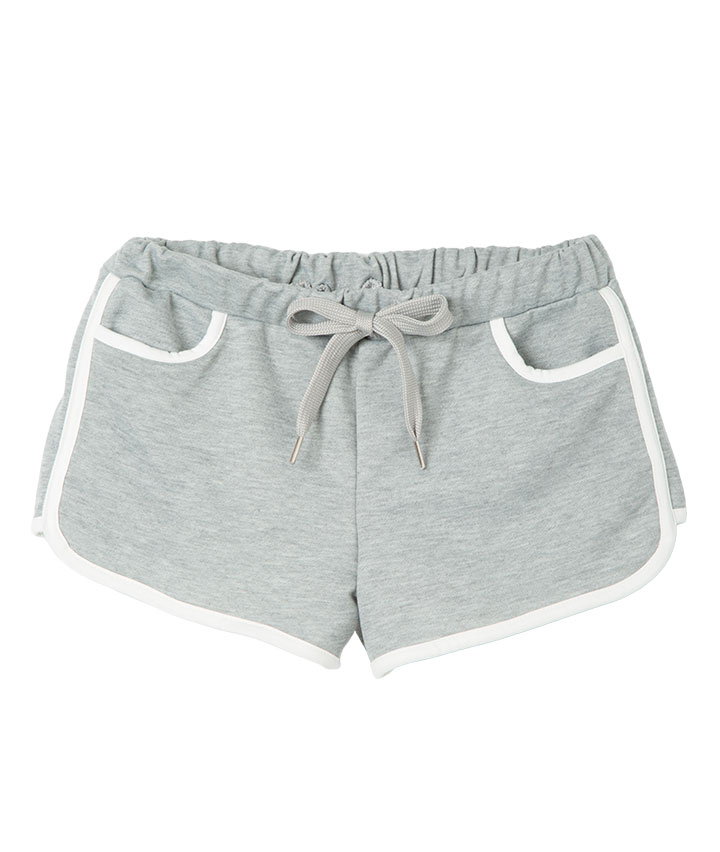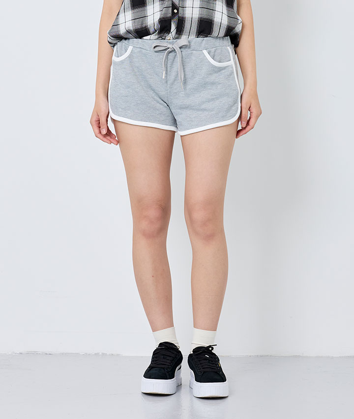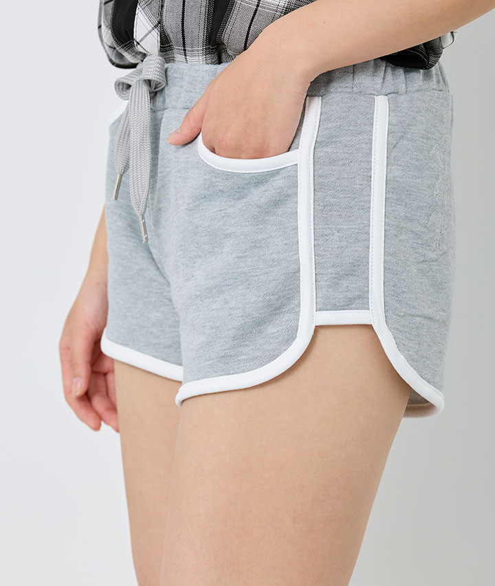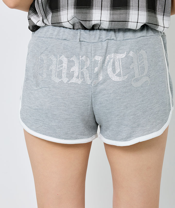 ・履き心地の良い短丈のホットパンツ。ブラックレターのラメプリントが人気のポイントです。