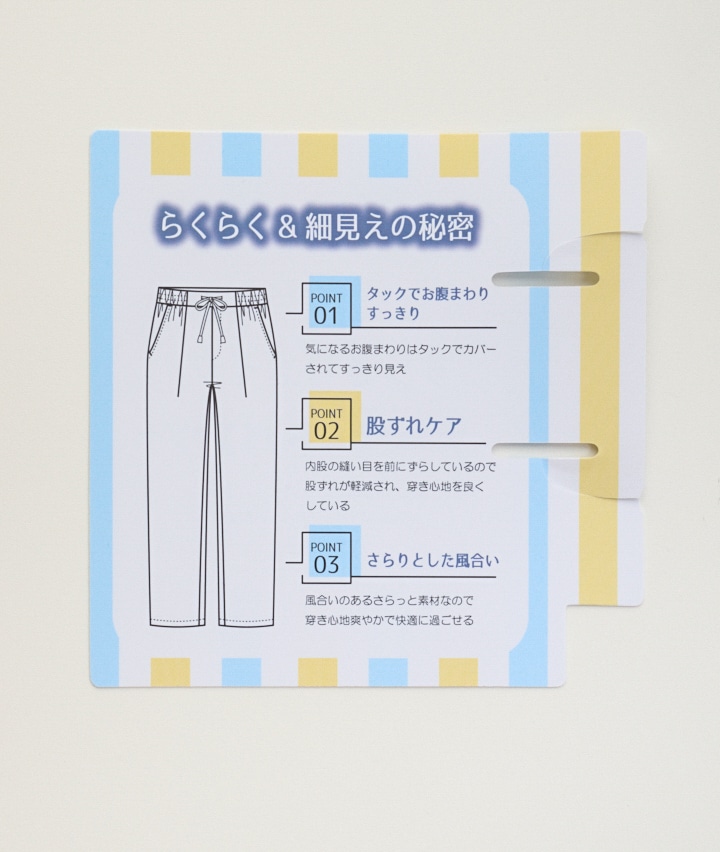・さらっとした肌触りと穿き心地で、ゆとりのあるお腹まわりとヒップでストレスフリーなパンツです。
