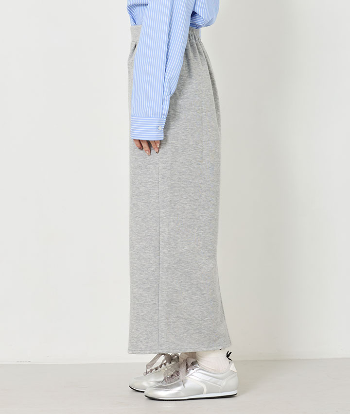・裏毛素材のナロースカート。ゆるっとした生地で快適な履き心地のアイテムです。どんなコーデにもなじむマストバイアイテムです。